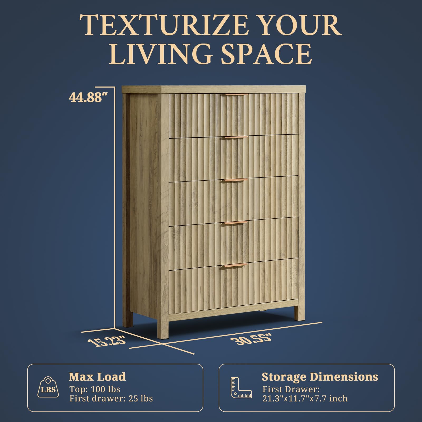 5 Drawers Dresser for Bedroom, 44 Inches Tall Modern Bedroom Dressers, Chest of Drawers for Bedroom, Fluted Dresser for Closet Organizer for Living Room, Hallway, Entryway (Sunwashed Ash Oak)
