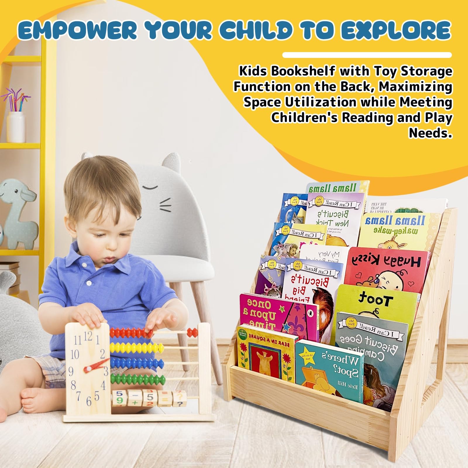 - Back Storage Compartment: This kids bookshelf does more than just attractively display books; it also includes a thoughtful back storage compartment. This extra space is ideal for storing additional books, educational materials, or toys, helping to maintain a tidy and organized reading or play area for your child.
