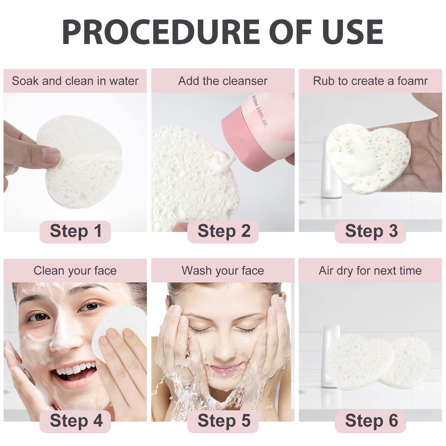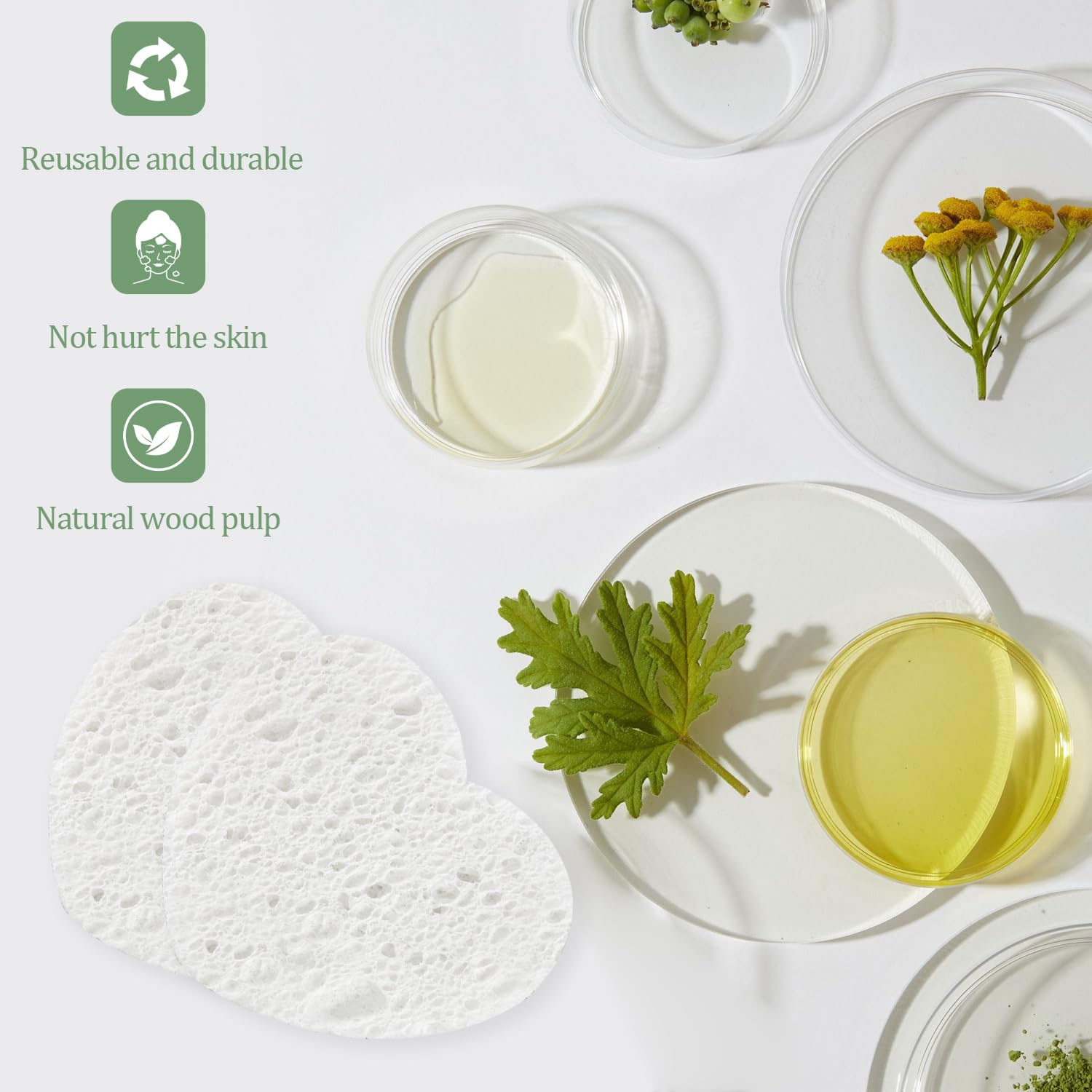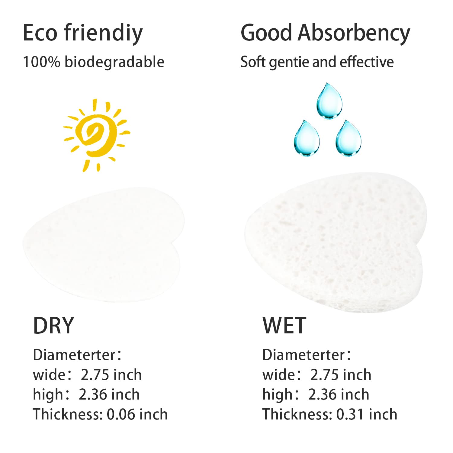 - Safe Material: These facial sponges are made of 100% natural sponge extracted from wood pulp, environmentally friendly. The compressed facial sponges do not contain irritating ingredients, are non irritating to the skin.