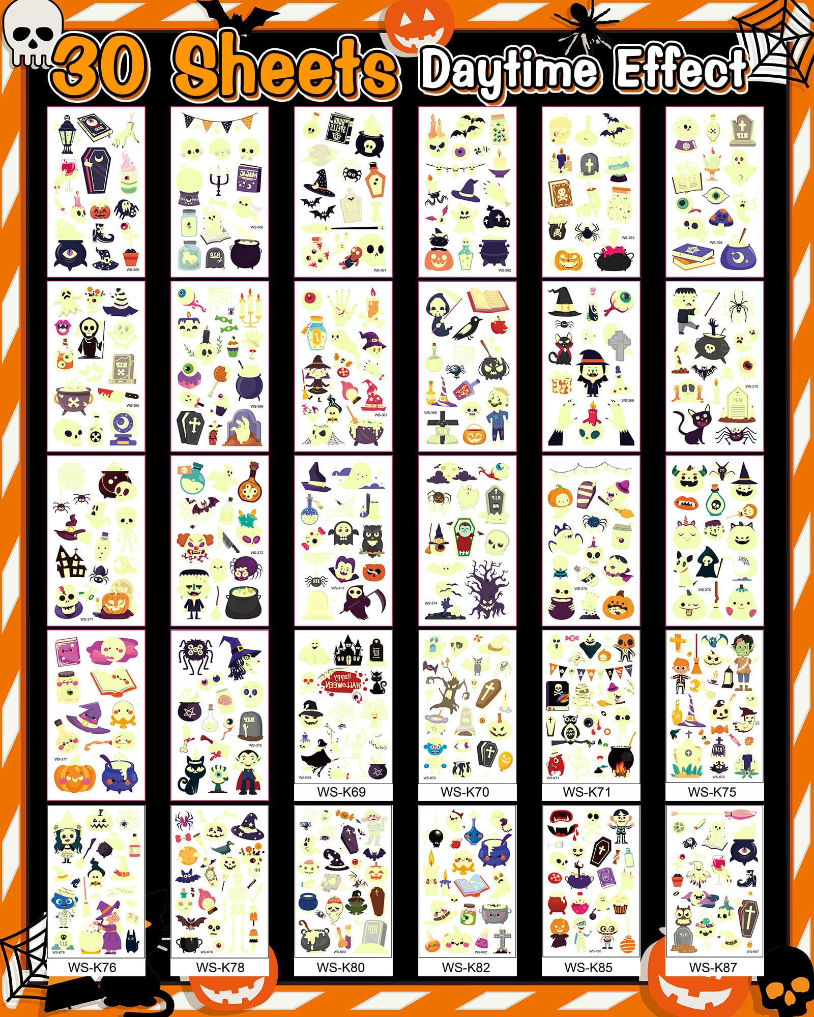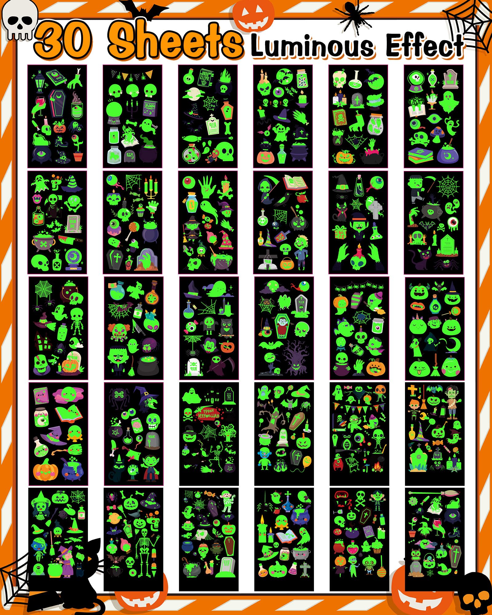 - 500 STYLES HALLOWEEN TATTOOS: 30 sheets luminous Halloween tattoos include witches, vampires, pumpkins, zombies, skeletons, lanterns, black cats, monsters and other Halloween-related elements, totaling 500 styles to meet your Halloween decoration needs. These Halloween temporary tattoos that glow in the dark will make you the focal point of the party.
