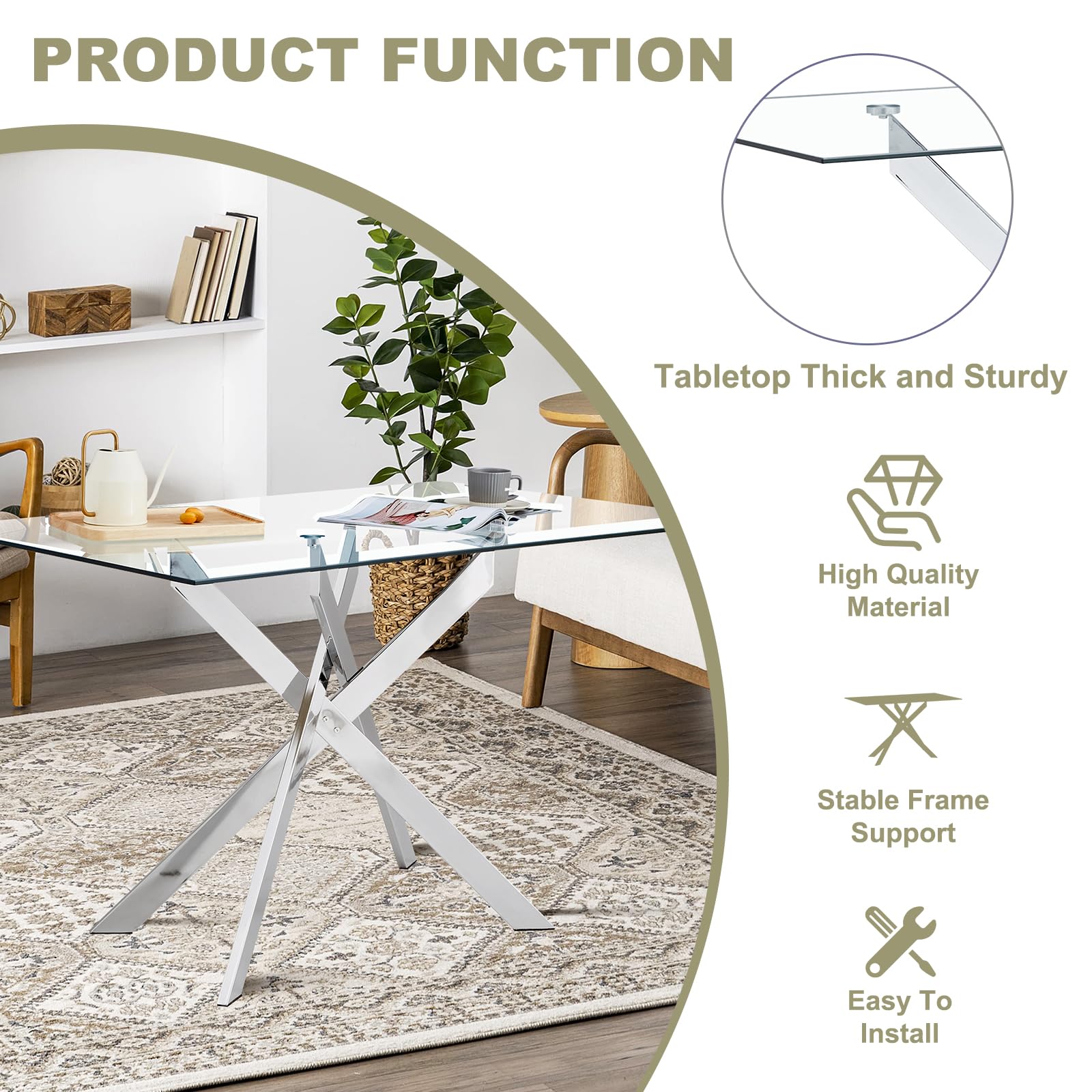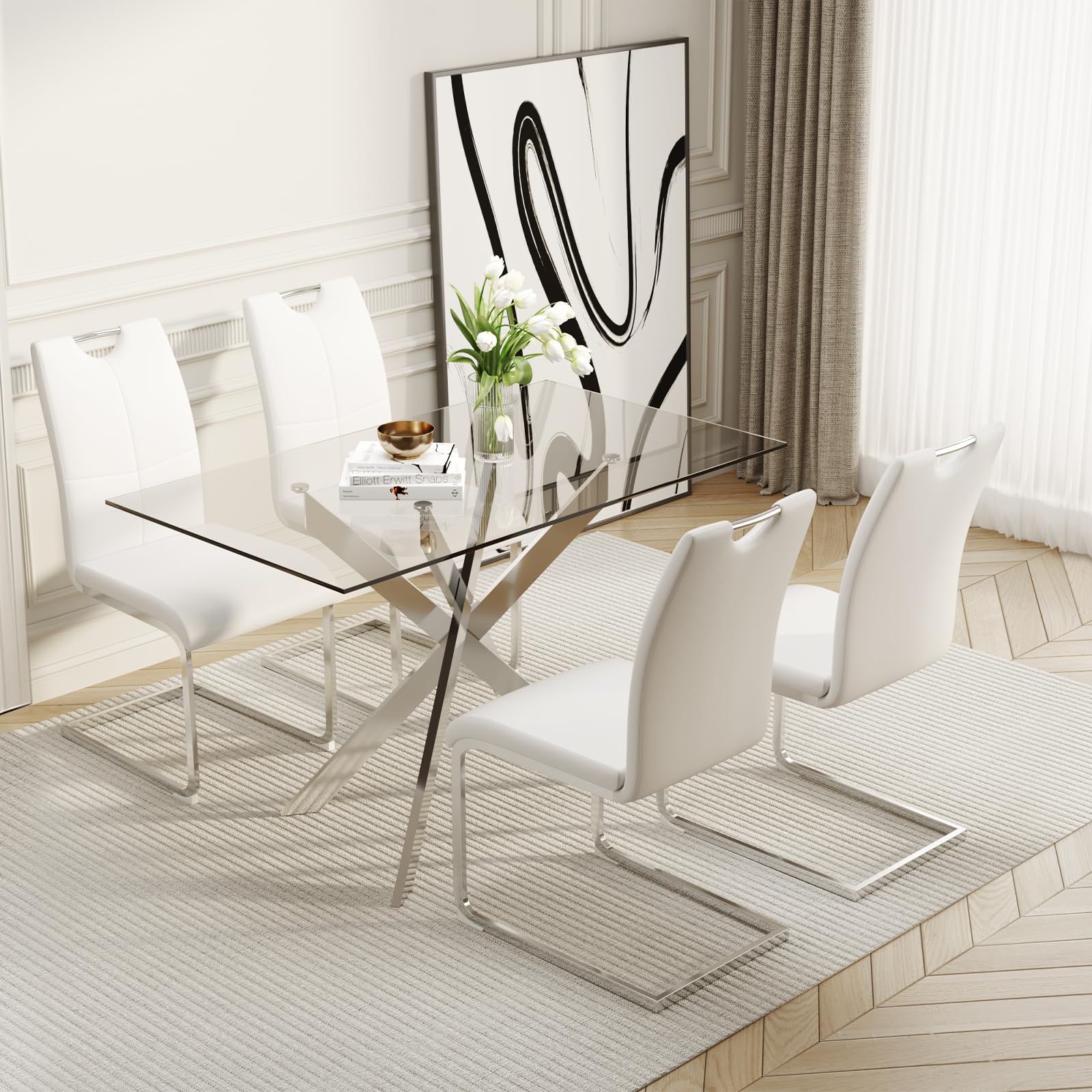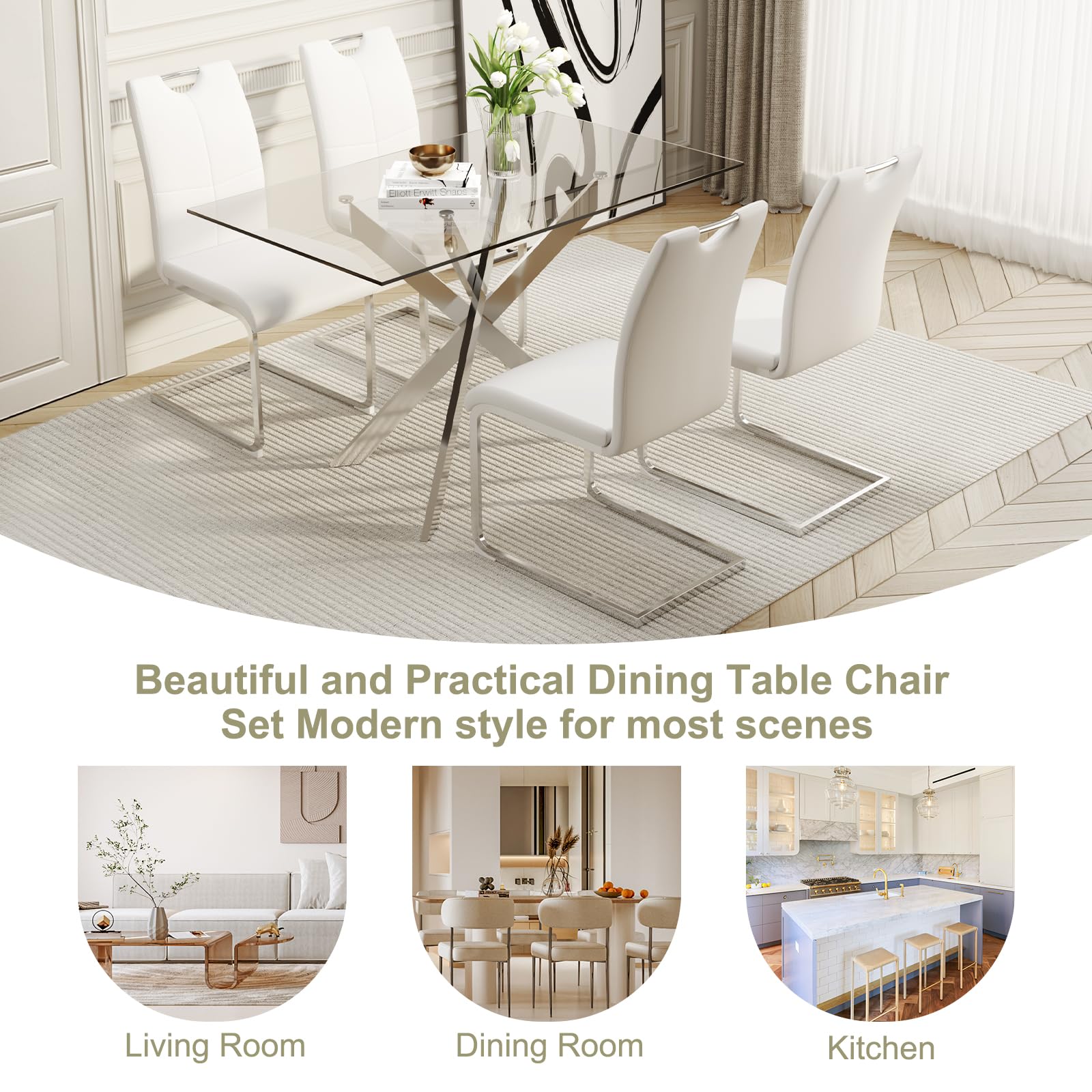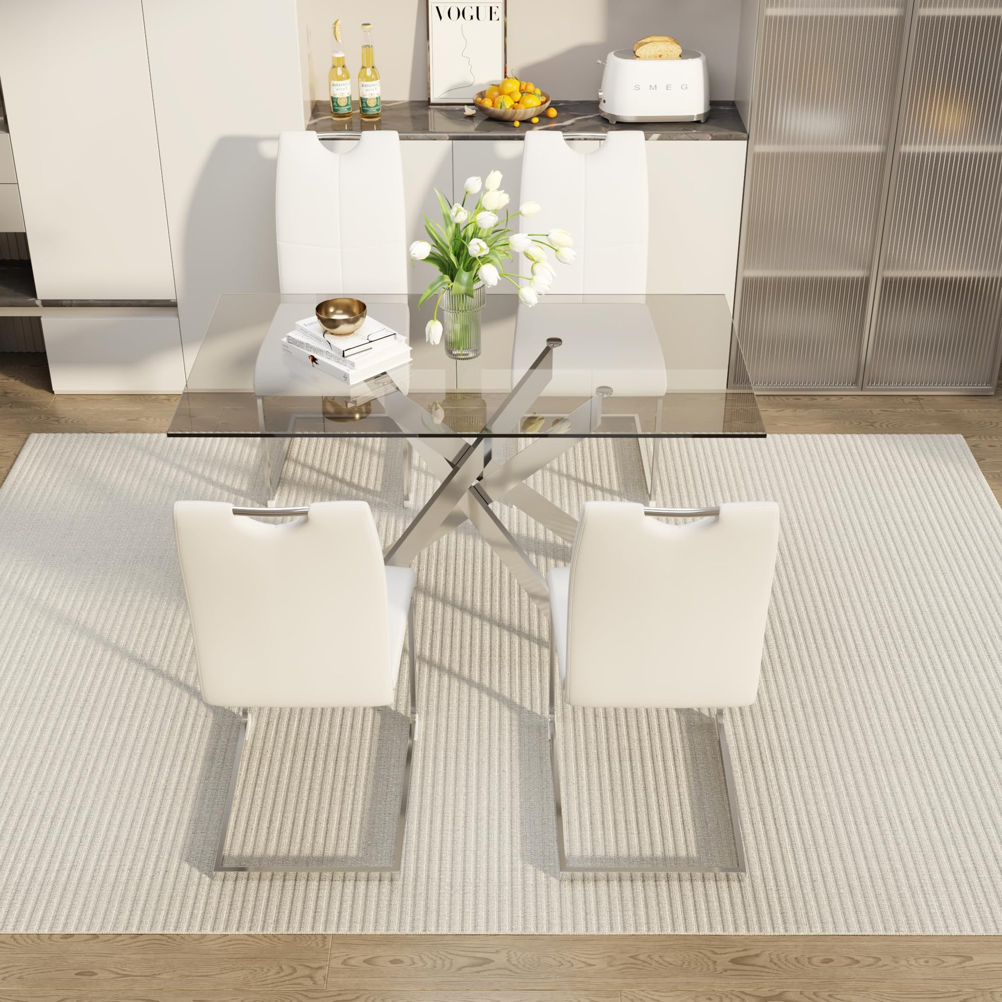 51.18" W Glass Dining Table Set for 4, Modern Rectangular Glass Kitchen Table with Sliver Metal Legs, 4 PU Leather Chairs with Silver Legs, for Dining Room, Home - White