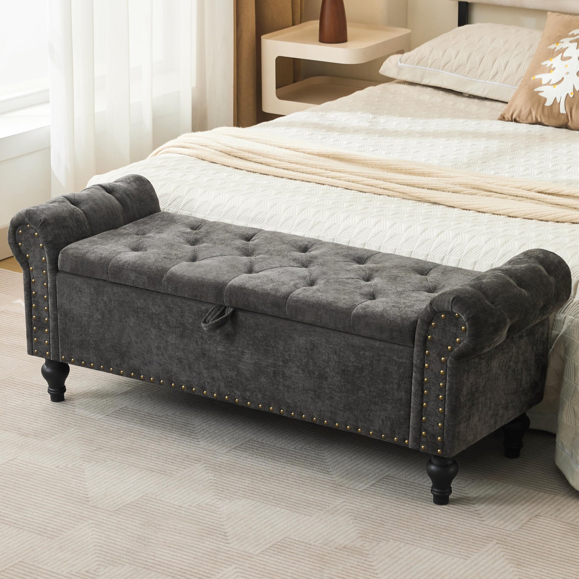51" Bedroom Storage Bench, End of Bed Bench with Storage, Chenille Upholstered Benches, Ottoman with storage, Window Benches with Rolled Arm and Nailhead Trim for Living Room, Entryway, Dark Gray