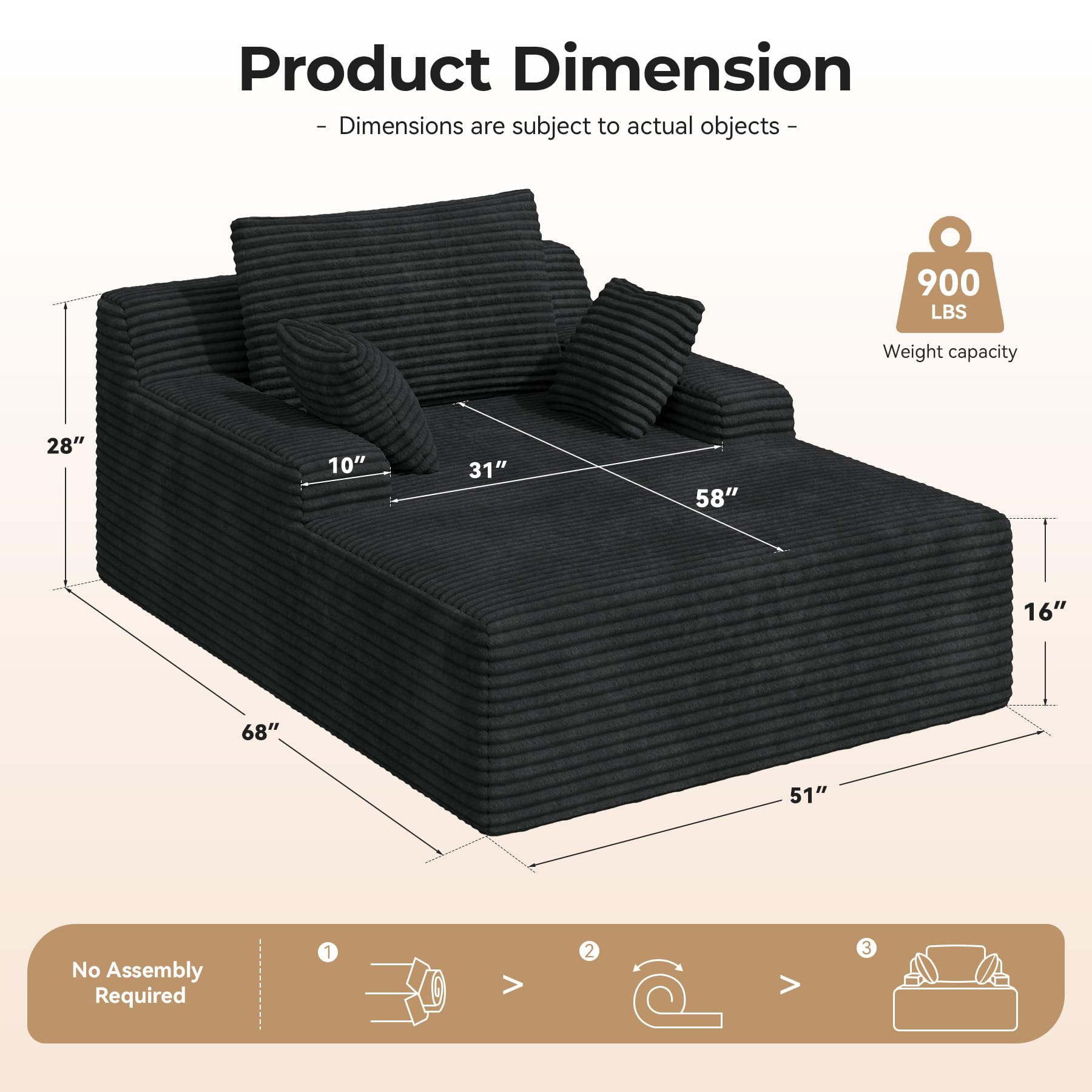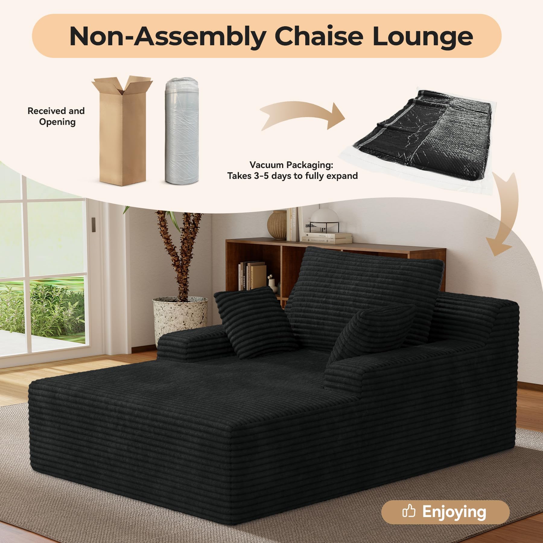 51'' Oversized Chaise Lounge Chair Indoor, Non-Assembly Deep Seat Sofa Bed Corduroy Sleeper Cloud Couch with 2pcs Pillows for Reading Living Room-Black