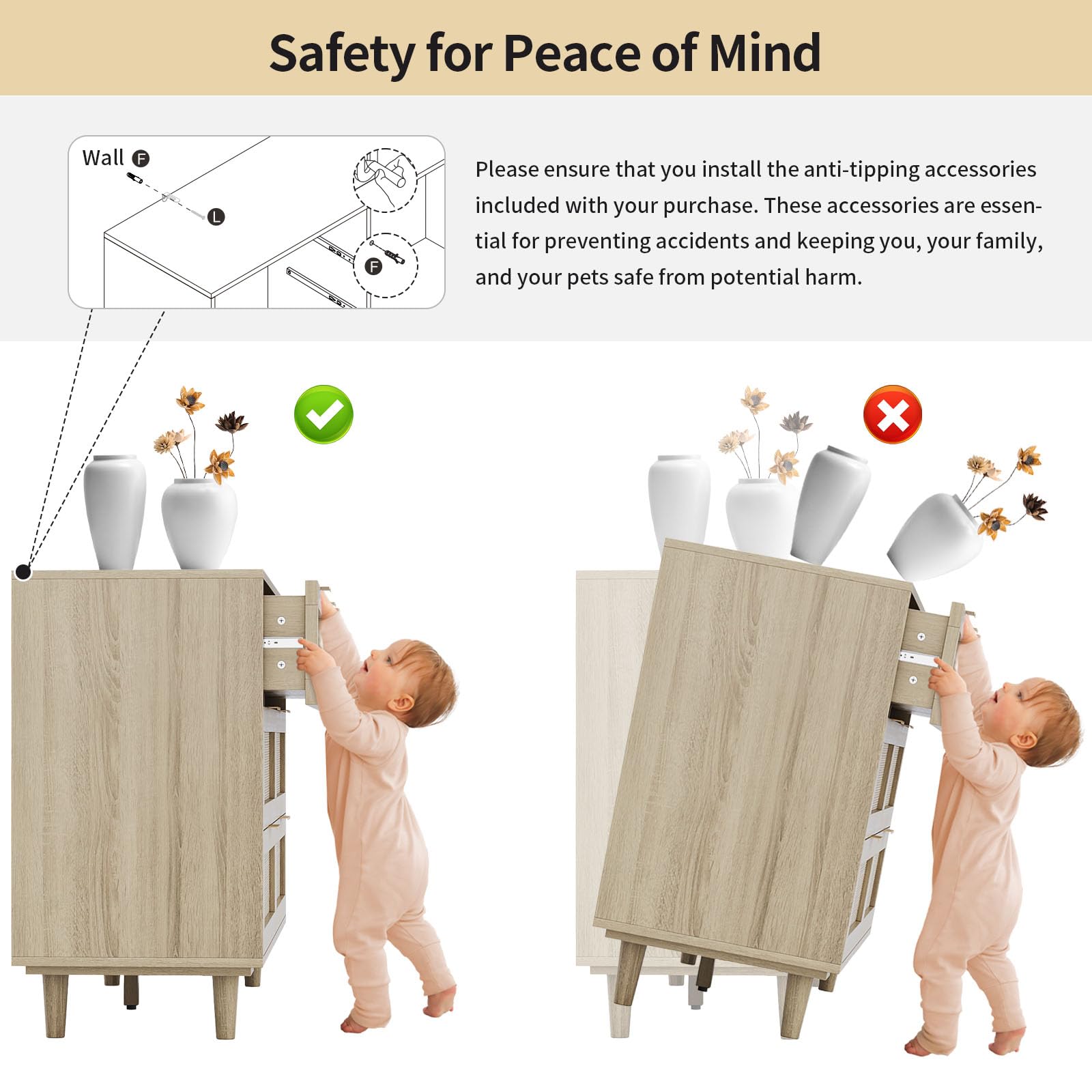 - 【Premium Material】Our dresser is made of high-grade particle board. 4 Solid wood legs support the whole body, ensuring stability and practicality. The premium metal guide rail with golden handle allows the drawer to be pulled out and closed smoothly. Anti-tipping device ensures safety.