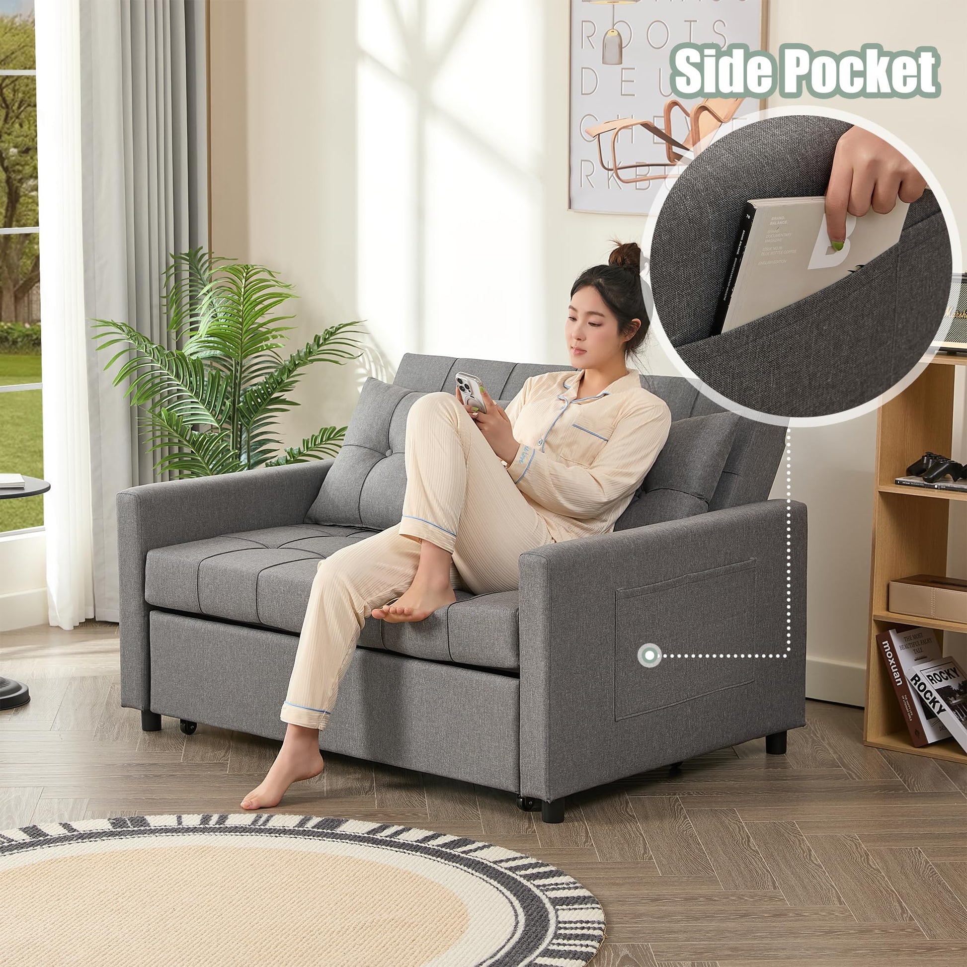 52" Sleeper Sofa with Pull-Out Bed, 3-in-1 Convertible Sofa Bed, Loveseat with Stepless Adjustable Backrest and Side Pocket, for Living Room Dorm Apartment, Linen, Light Gray