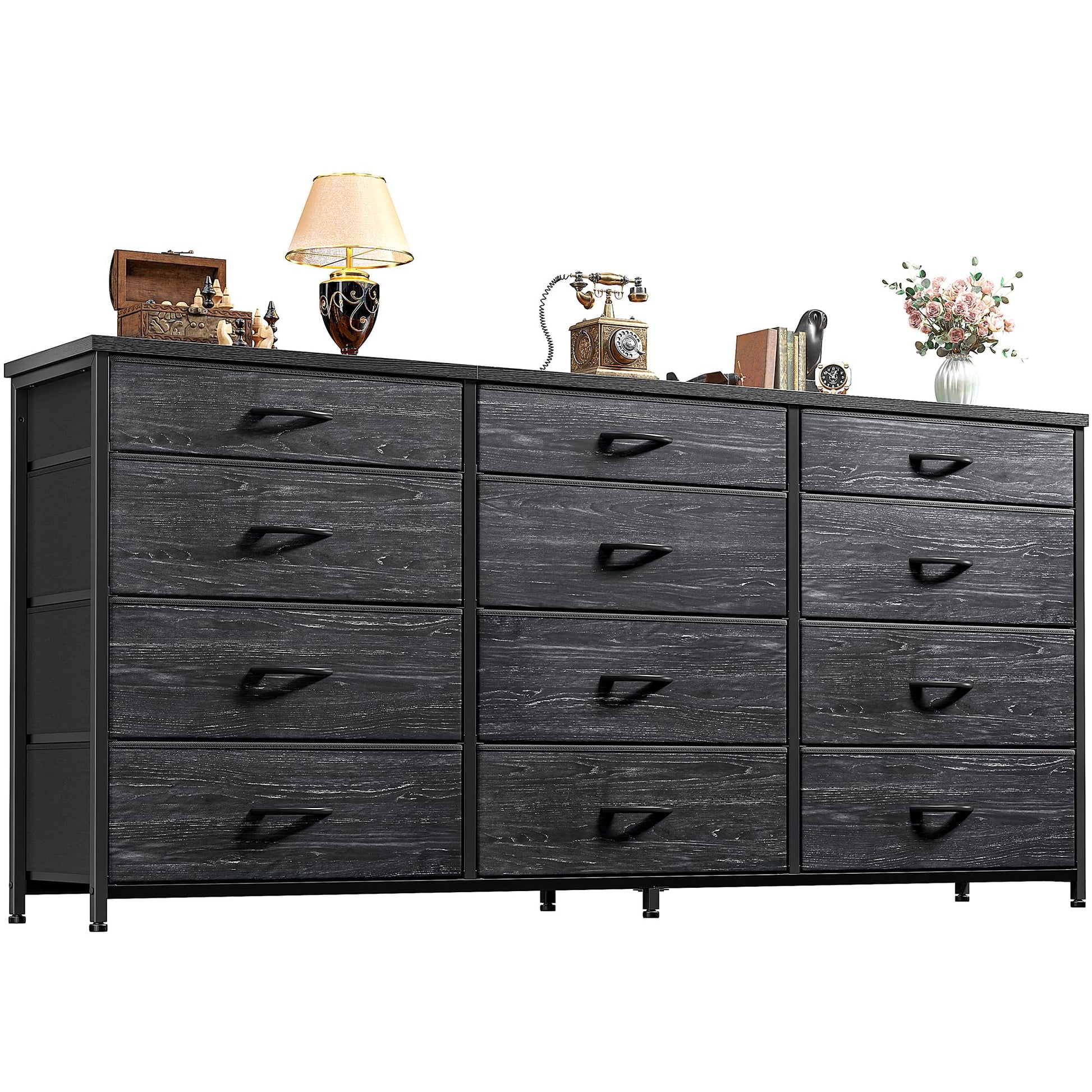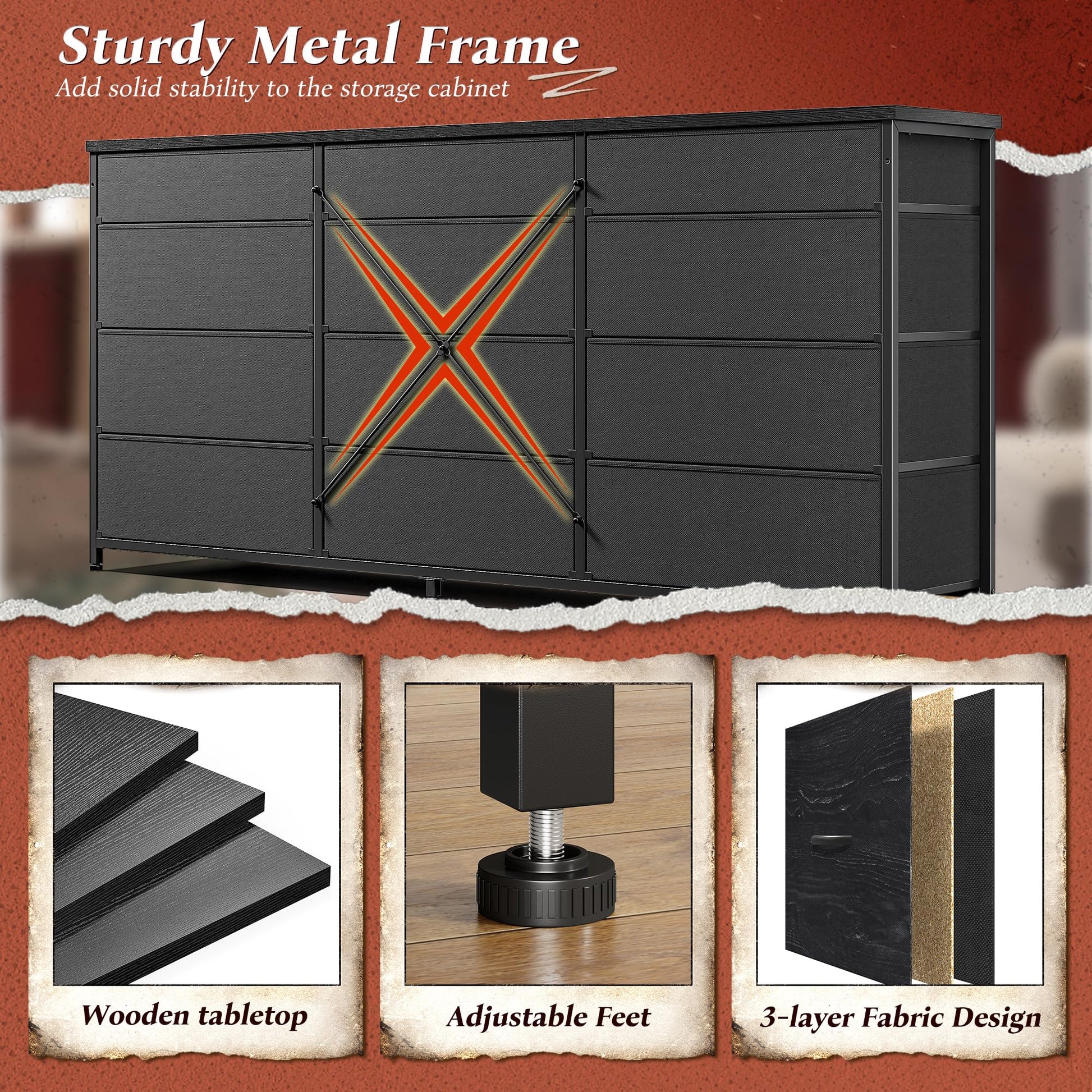 55" Long Dresser for Bedroom with 12 Fabric Drawers, Entertainment Center for 60 inch TV Dressers & Chests of Drawers Large Storage Organizer for Closet, Living Room, Metal Frame, Wood Top, Black