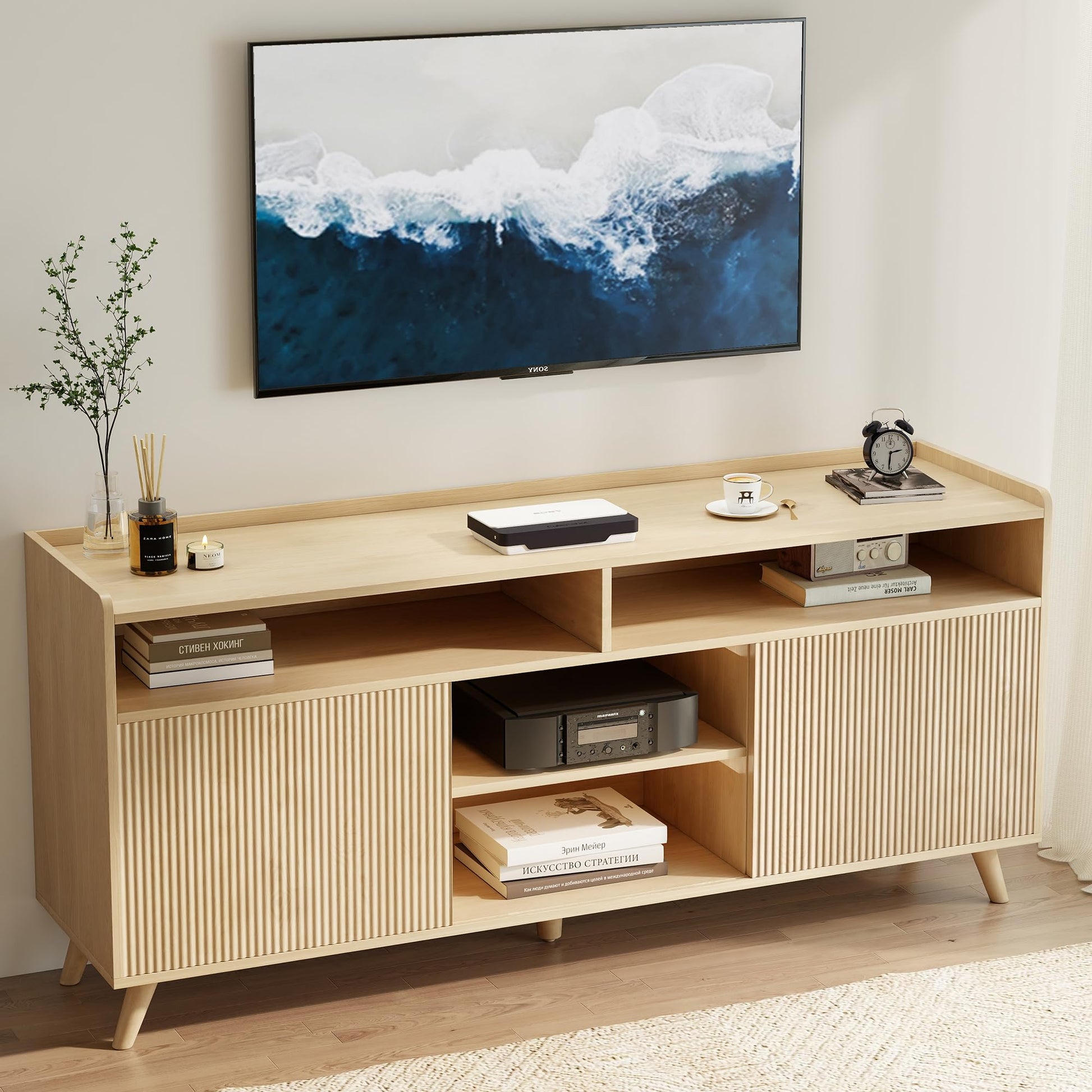 55'' TV Stand for 65 Inch, Fluted Modern TV Stands for Living Room with Sliding Doors and Adjustable Shelf, Entertainment Center with Storage Media TV Console Table for Bedroom (Natural Oak)