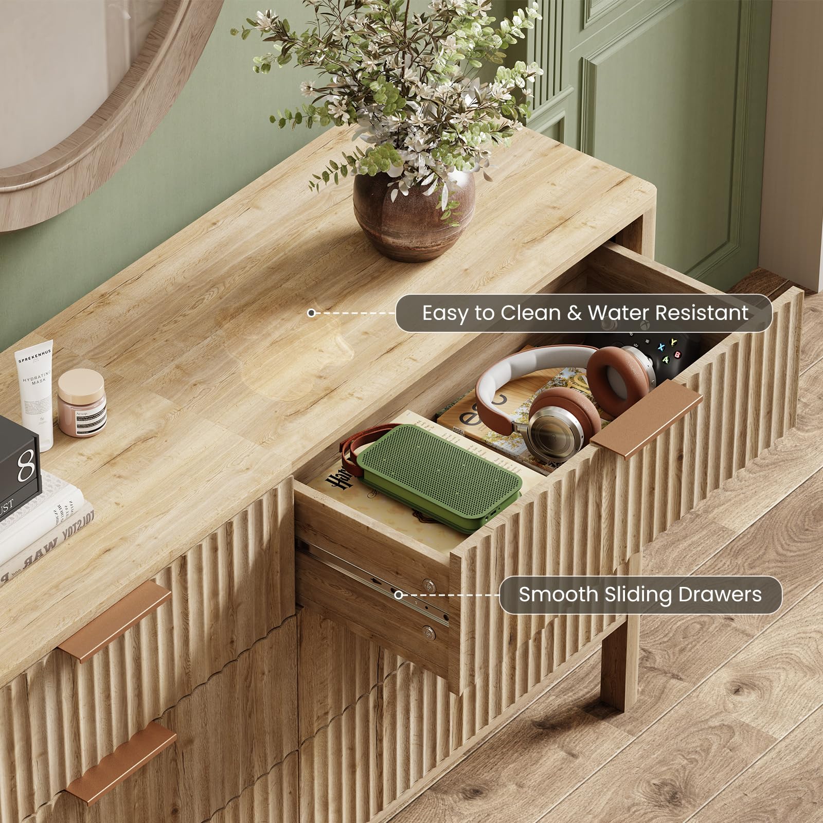 55" Wide Fluted 6 Drawer Dresser for Bedroom, Wooden Dresser Modern Chest of Drawers TV Stand Dressers with Organizer Storage for Bedroom, Living Room, Entryway, Oak