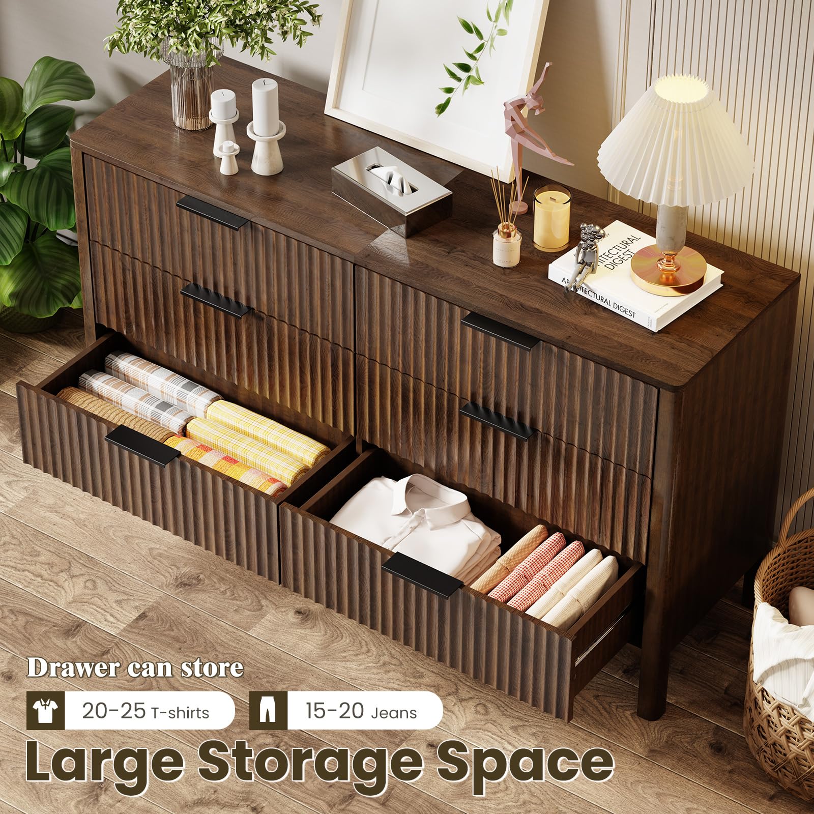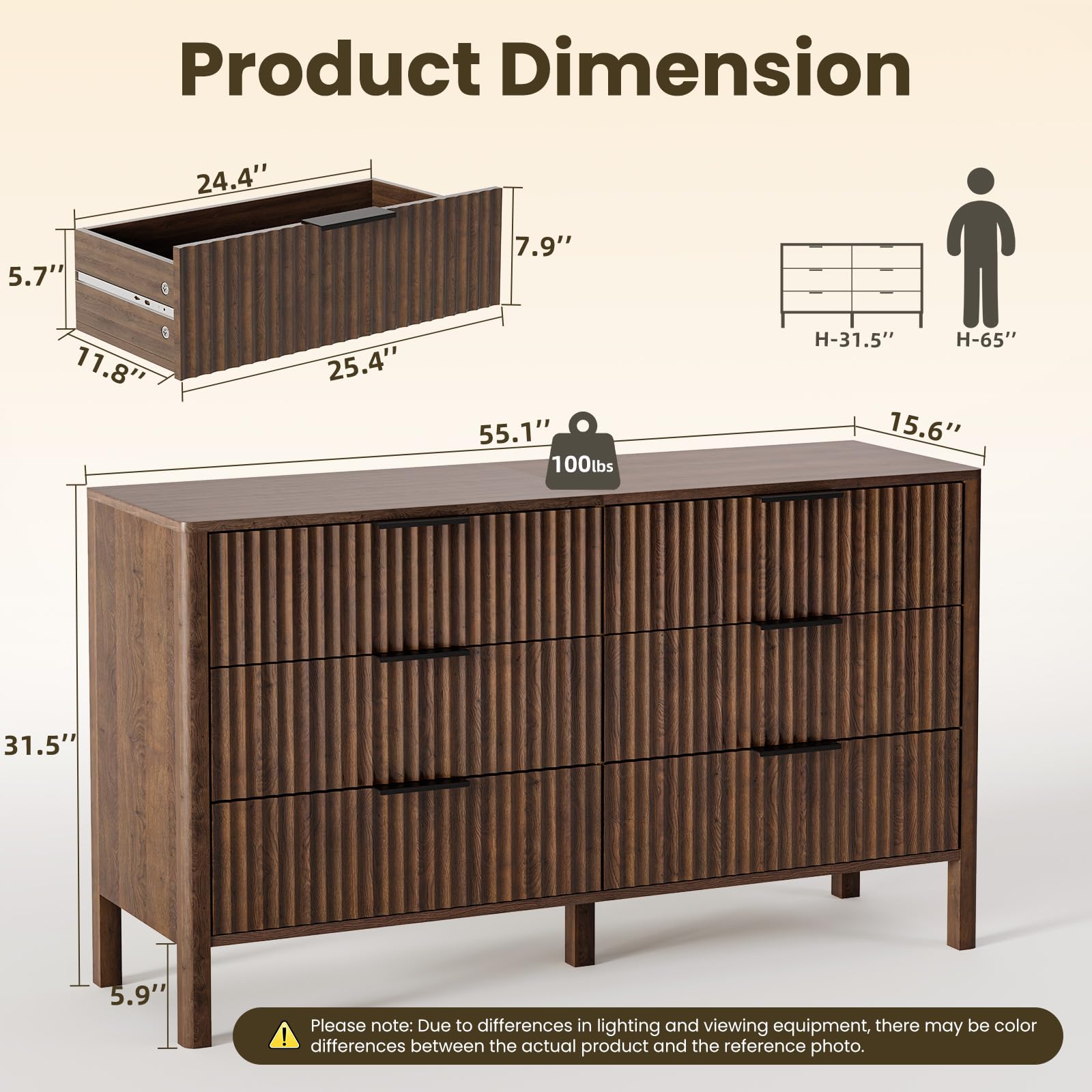 55" Wide Fluted 6 Drawer Dresser for Bedroom, Wooden Dresser Modern Chest of Drawers TV Stand Dressers with Organizer Storage for Bedroom, Living Room, Entryway, Walnut