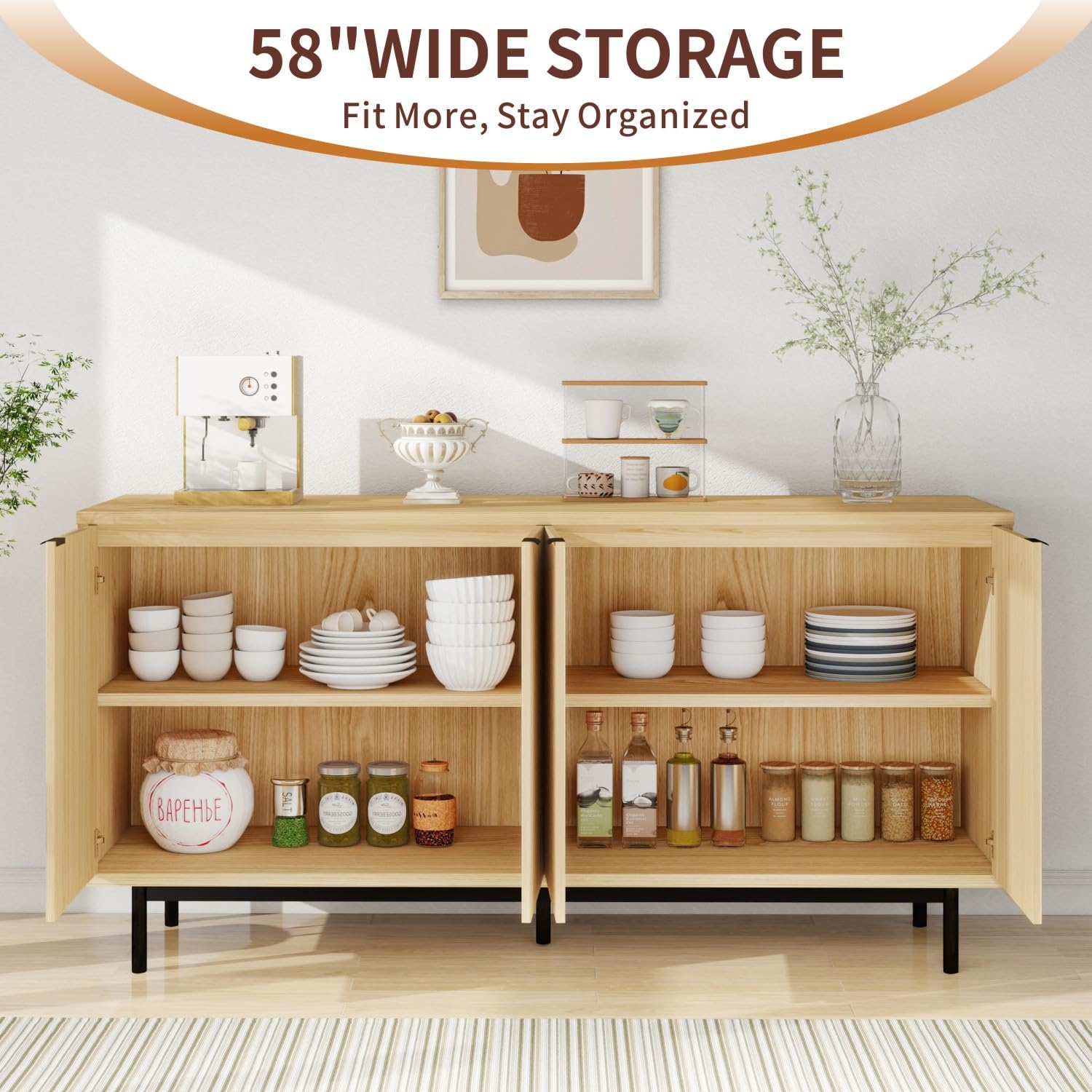- [Striking Modern Design In Warm Natural Oak]Elevate your space with this 58-inch sideboard featuring sophisticated fluted door panels. The warm Natural Oak cabinet finish, subtly accented with contemporary hardware, creates a stylish statement piece for any modern decor.