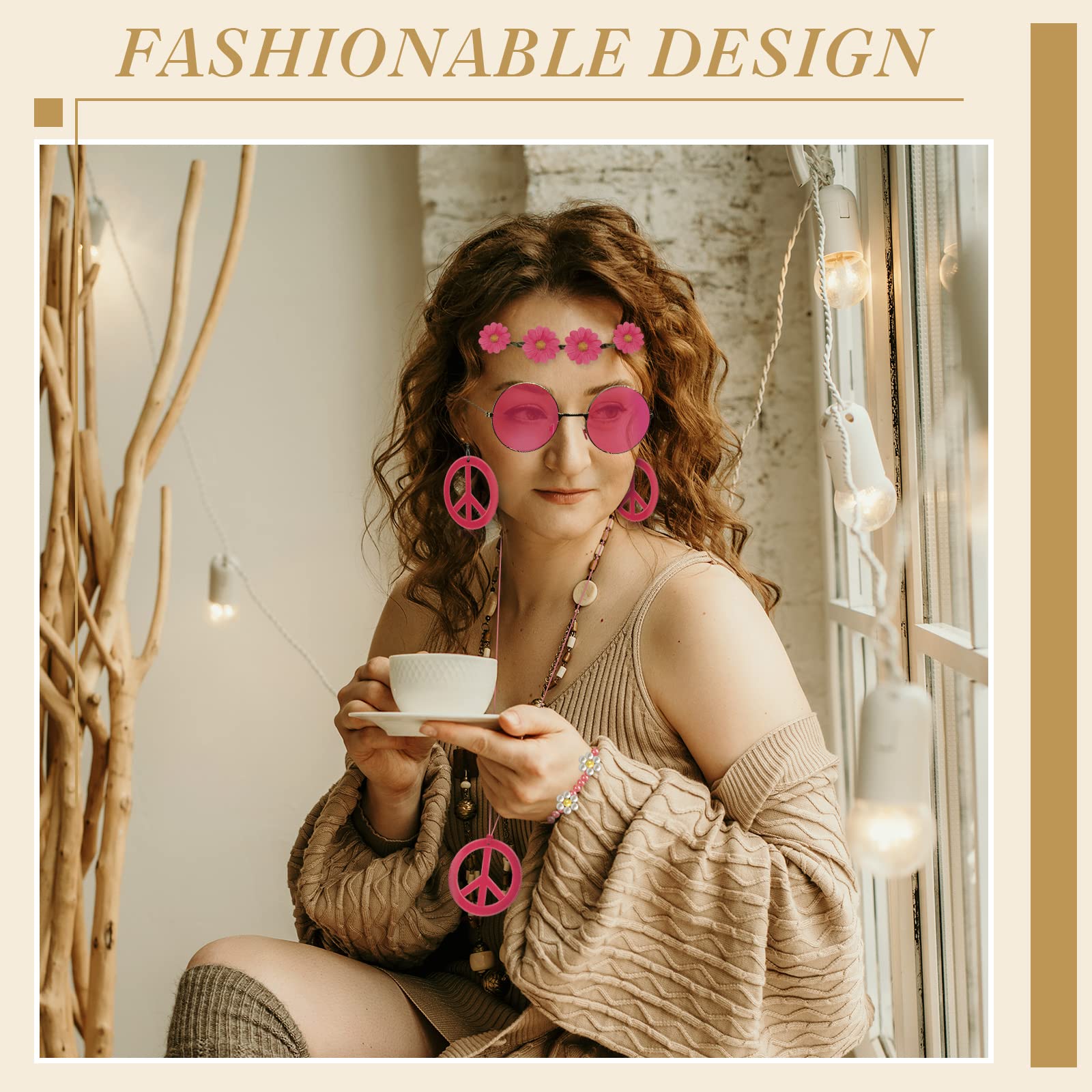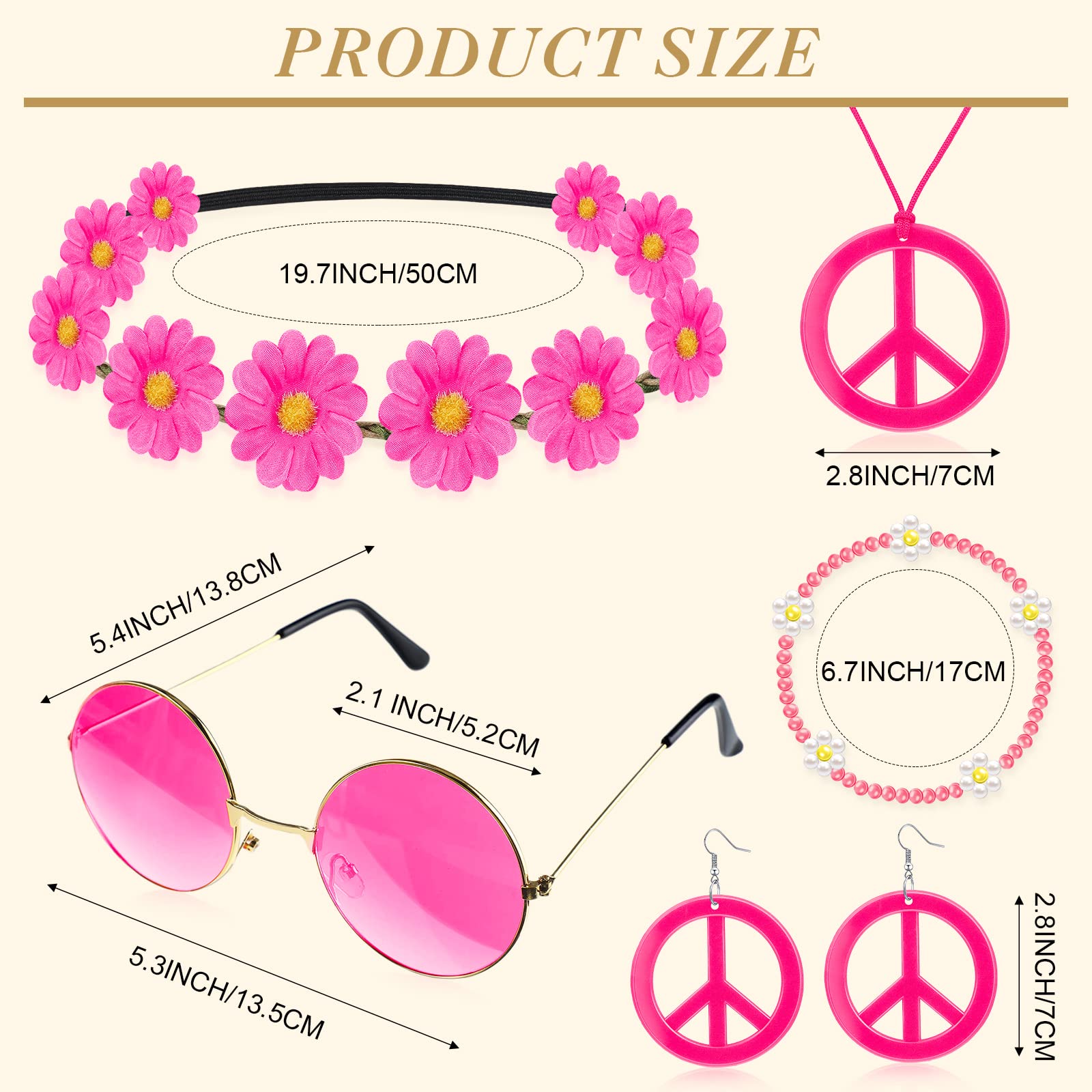 6 Pcs Hippie Costume Accessories Set, Boho Peace Sign Daisy Flower 60s 70s Party Favors Decorations for Groovy Party Girls (Rose Red)
