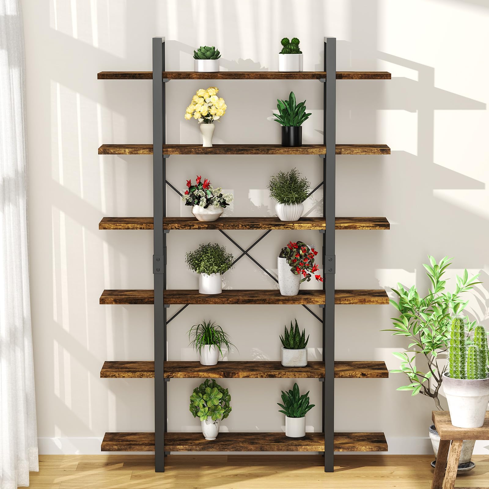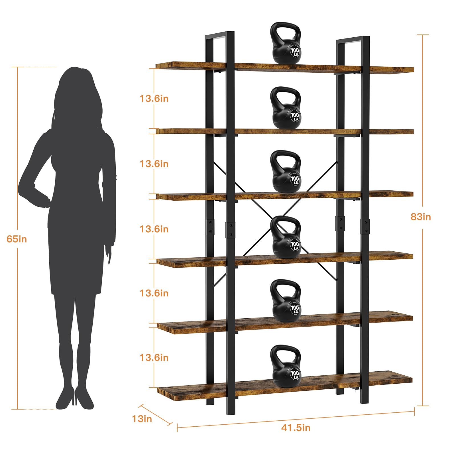 - 【Industiral Style & Home Decor】This vintage open bookshelf is made of rustic MDF board and black coated metal frame, its industrial design makes your home outstanding and impressions. It features double wide and 6 open and spacious shelves for you to store.It can be placed in bedroom, living room, wall corner, entryway, office, etc. No matter where you put it, it will become an eye-catcher in your space