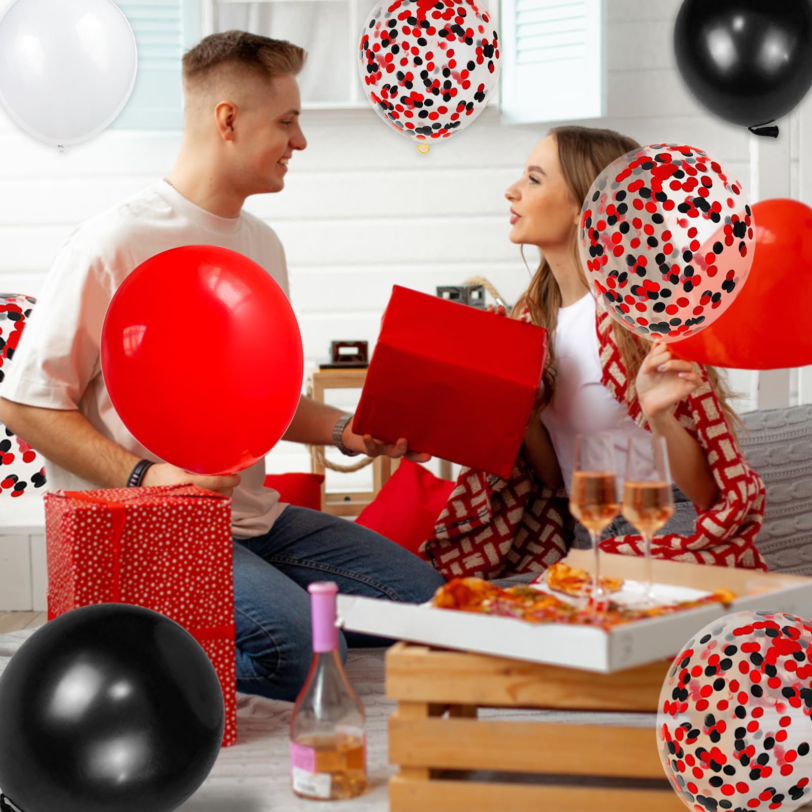 - 【Red black and white party decorations balloons packing】 This balloon kit includes 20 black balloons, 20 red balloons, 20 white balloons, 8 pcs black and red confetti balloons, 2 rolls ribbons. All the balloon size is about 12 inches after inflation.
