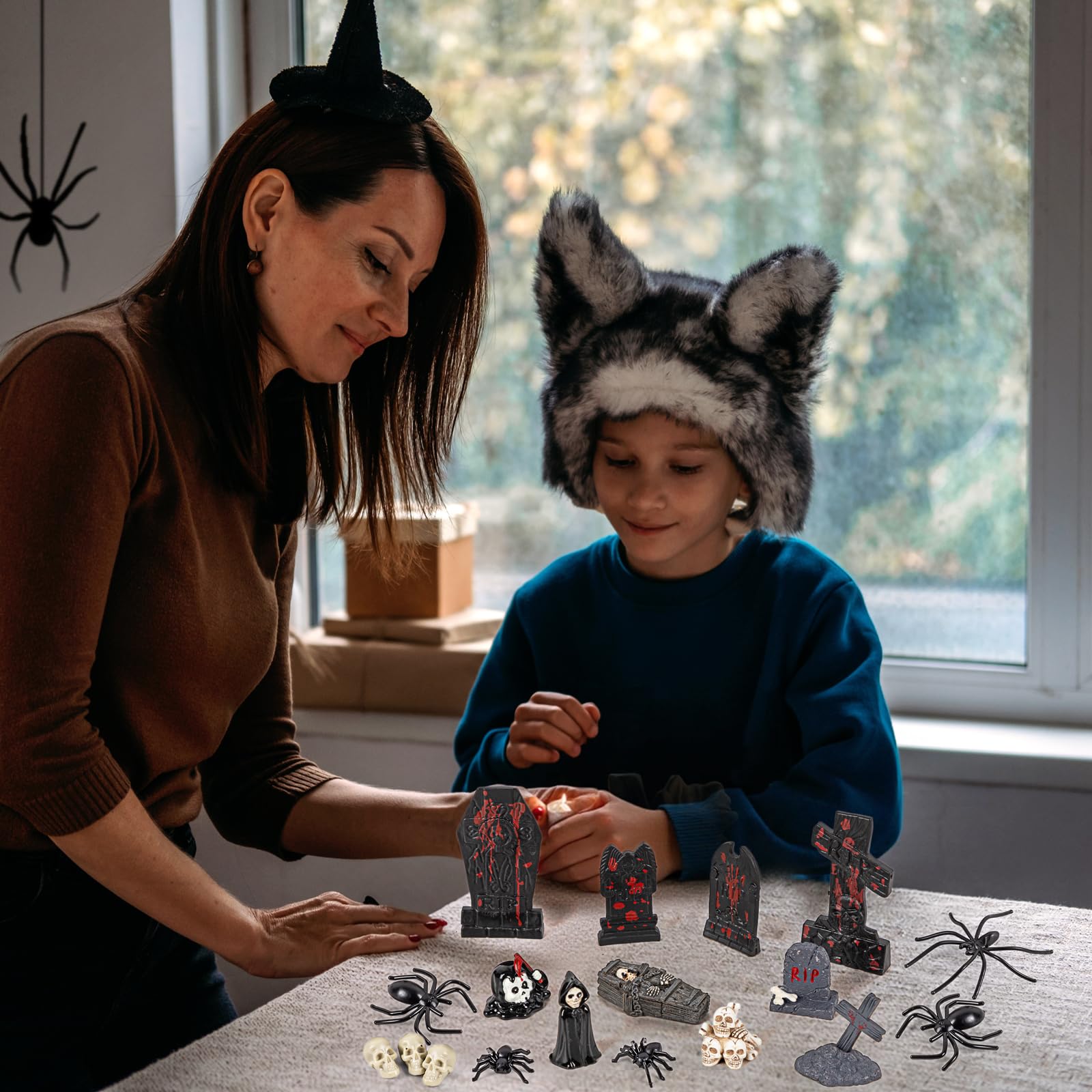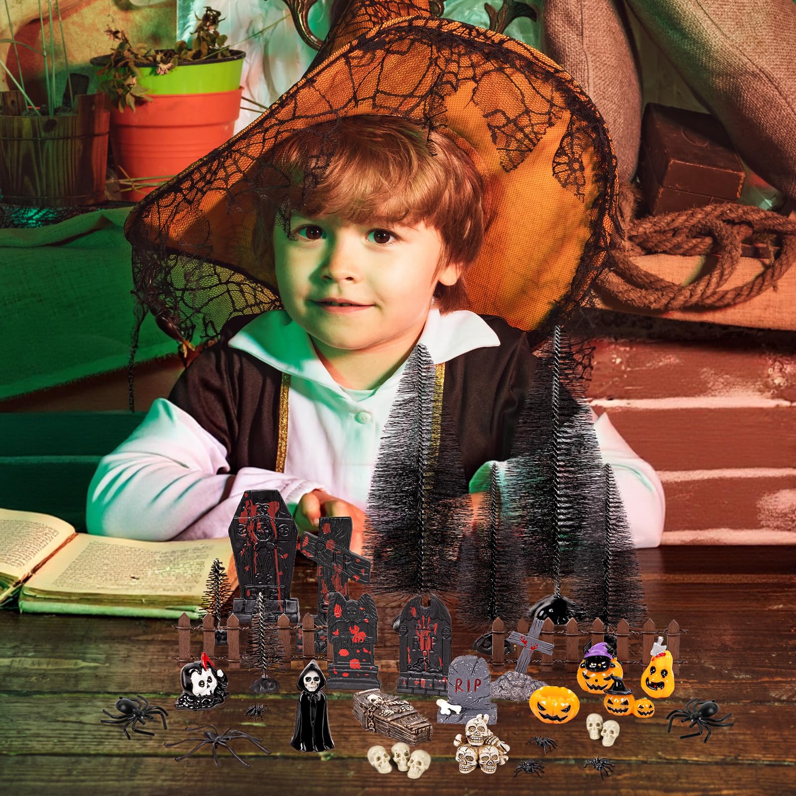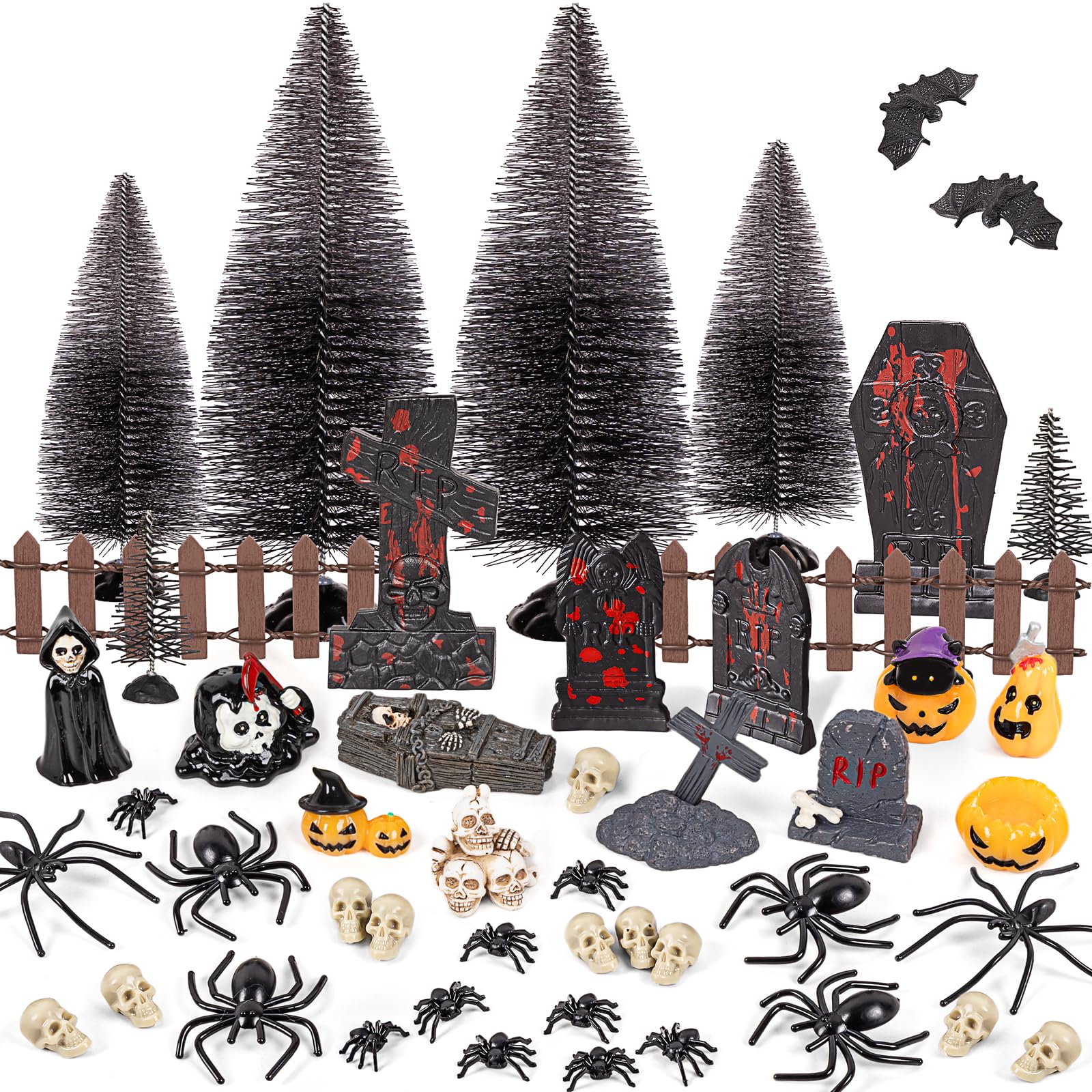 - Halloween Village Accessories Set: this set includes a total of 69 pieces, featuring 7 tombstones, 29 spiders, 2 bats, 4 pumpkins, 16 skulls, 2 figures, 6 trees, 2 fences, and 1 piece of spider web cotton. All items are designed to help you recreate a haunted Halloween atmosphere in miniature form—great for diorama projects or themed seasonal displays