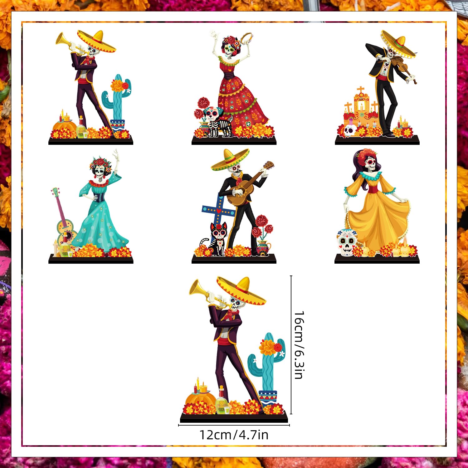 - Easy to Use: You will receive 6 different styles of Day of the Dead decorations. Each Day of the Dead decorations is approximately 4.7 x 6.3 inches in size. Each Dia De Los Muertos decorations is designed with a wooden base to ensure that the decoration can stand stably in any environment. All you need to do is push the wooden top into the slot of the base, and you will have a perfect decoration