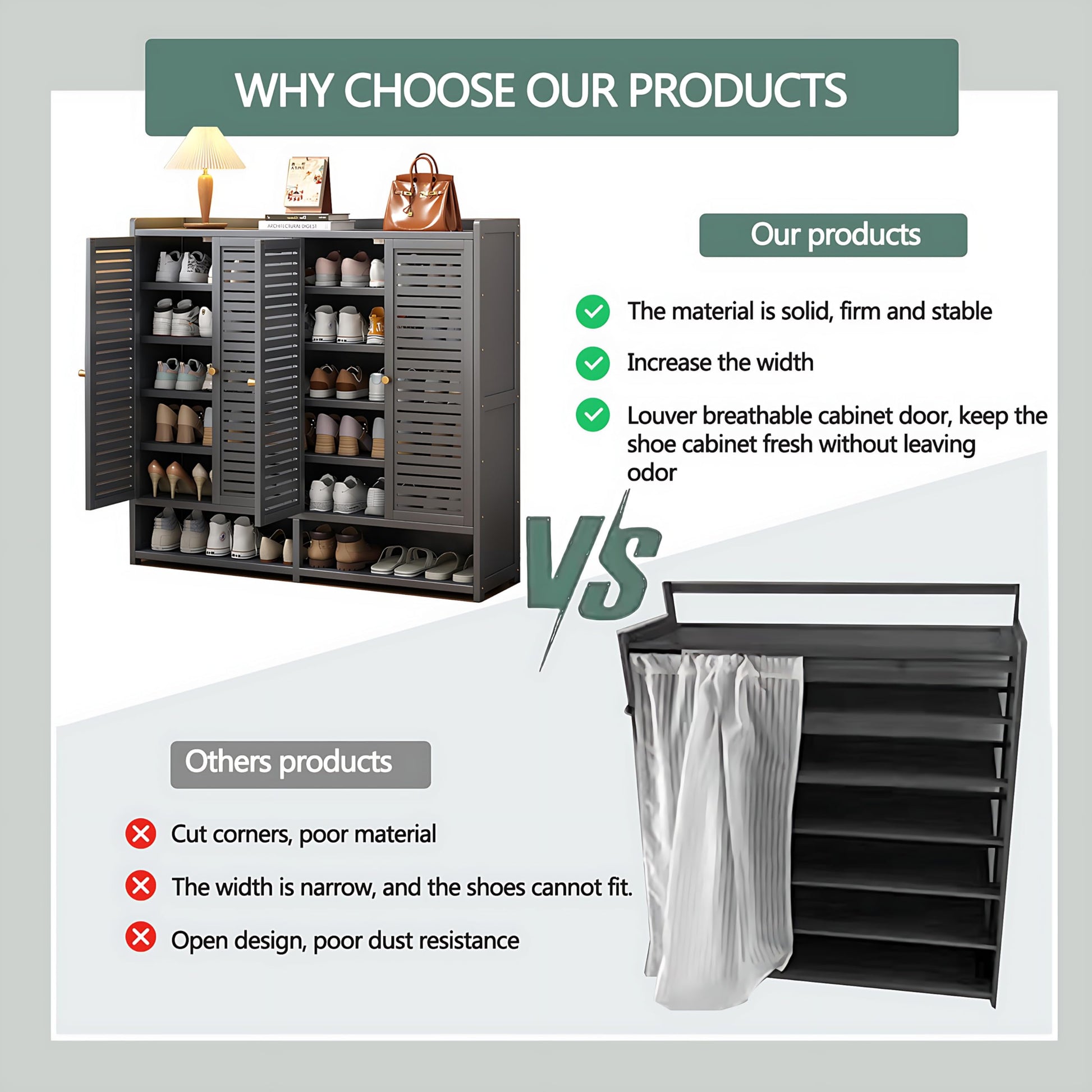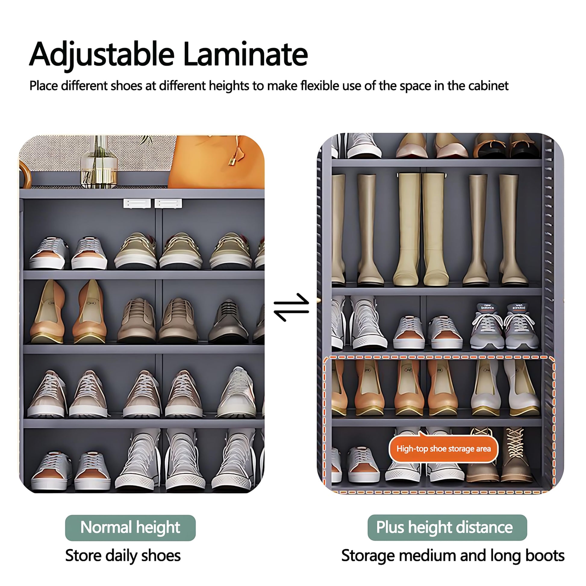 - [7-Tier large-capacity storage, scientific partition] The size of the shoe cabinet is 44.9 "D x 13.7" W x 43.3 "H. The adjustable layer thickened platen design can easily store 36 + pairs of shoes. Suitable for different shoe types such as sports shoes, high heels, boots, etc. The widened countertop at the top can be placed with keys, green plants and other decorations. The cabinet door is designed with louvers and breathable double doors, which are ventilated and easy to take care of. The closed independent structure can effectively reduce chaos, make full and reasonable use of narrow areas, and provide ideal storage for messy shoes.