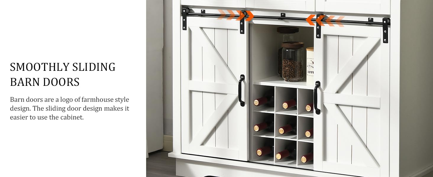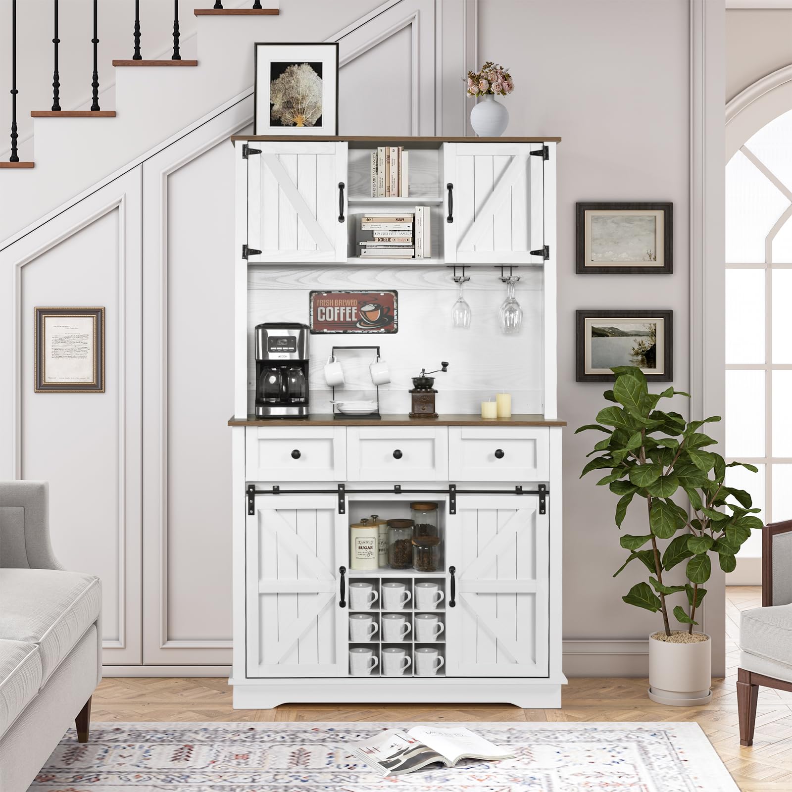 - Farmhouse & Classic Coffee Hutch Cabinet Bar: This coffee and wine bar cabinet is designed with an X-shaped sliding barn door, which allows for easy access to the cabinet and saves space. The flexible barn door can slide to both sides, creating a symmetrical aesthetic on both sides or in the middle, making dining room hutch an ideal coffee bar cabinet
