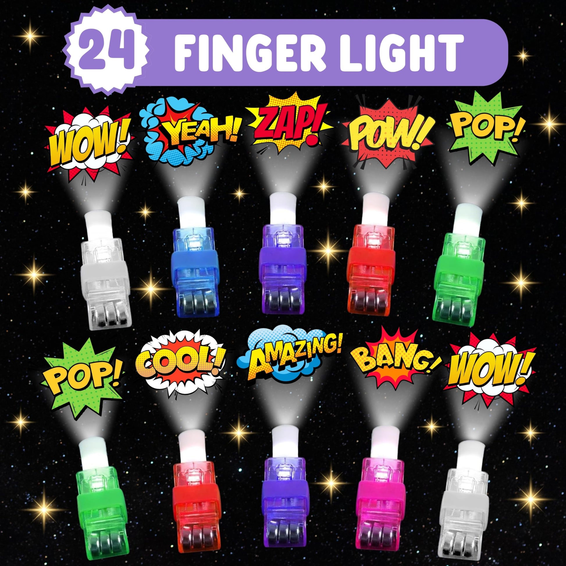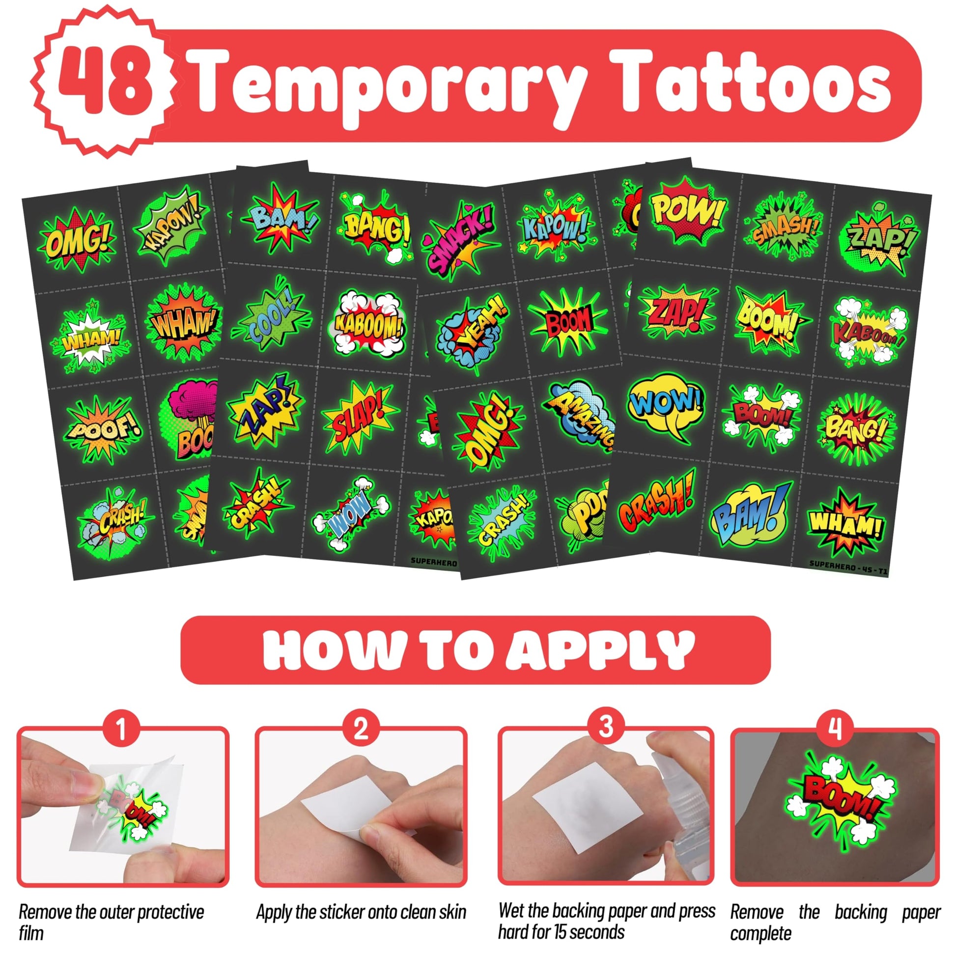 - Super Hero -Themed Party Favors Combo – 24PCS LED Finger Lights + 48PCS Pre-Cut Glow In The Dark Temporary Tattoos. Unleash the ultimate Super Hero experience with this action-packed party combo! Featuring 24 LED Finger Lights in 8 unique designs and 48 vibrant, pre-cut luminous temporary tattoos, this set is the perfect way to light up any Super Hero -themed birthday or celebration! Just press the switch to project glowing symbols, then let kids show off their power with easy-to-apply tattoos – no scissors needed!
