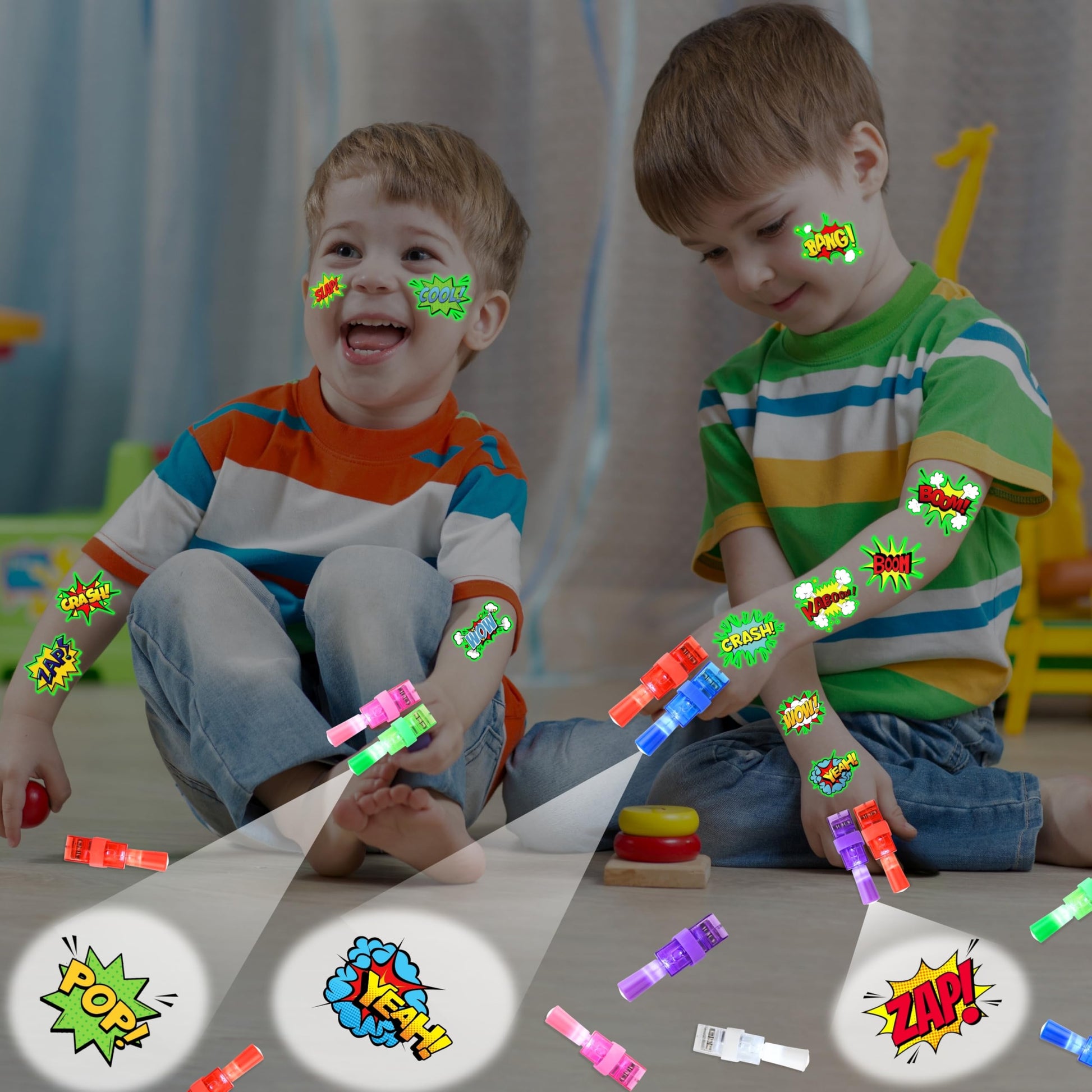 - Super Hero Fun Gift Ideas for kids: Ideal for goodie bags, party favors, classroom prizes, stocking stuffers, or Halloween treats. Kids will love lighting up their fingers and sharing action-packed tattoos with fellow heroes-easy to apply, no scissors needed!