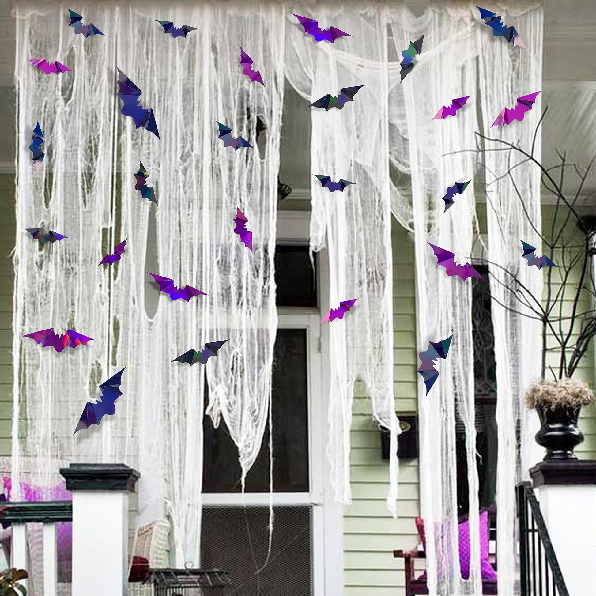 - 🦇PACKAGE CONTAINS- Our iridescent bats halloween decoration kit include 36pcs purple iridescent bats wall decal and 36pcs in black iridescent color,Each color has 4 different sizes, and comes with 80 pcs double sided adhesive dots.