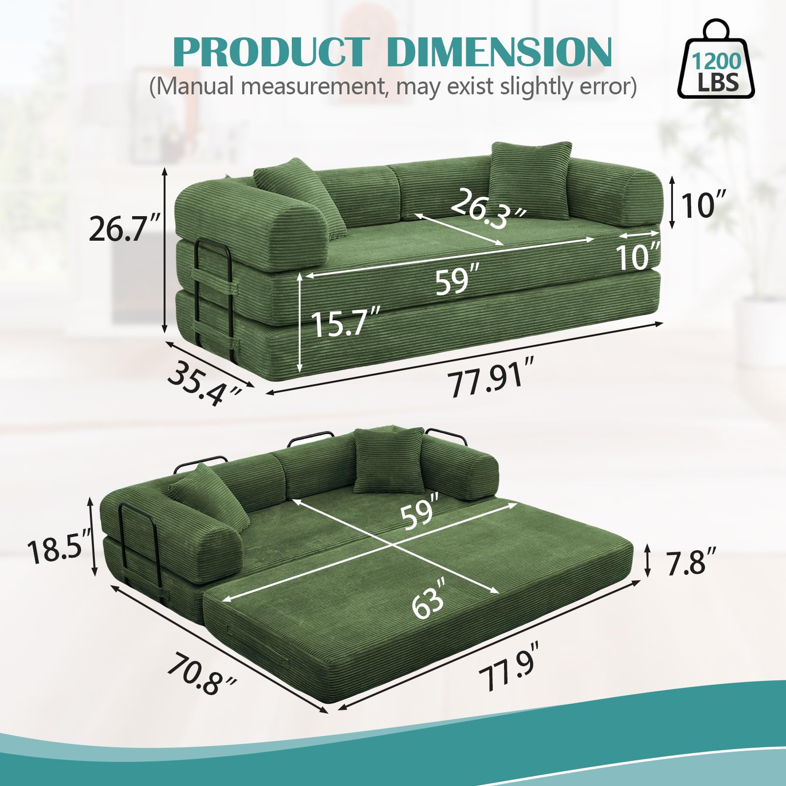 - Premium Comfort: Pholstered in soft, breathable corduroy fabric, this folding sofa bed is designed with high-density memory foam and plush pillows. It provides strong support and effectively relieves stress, allowing you to experience unparalleled relaxation