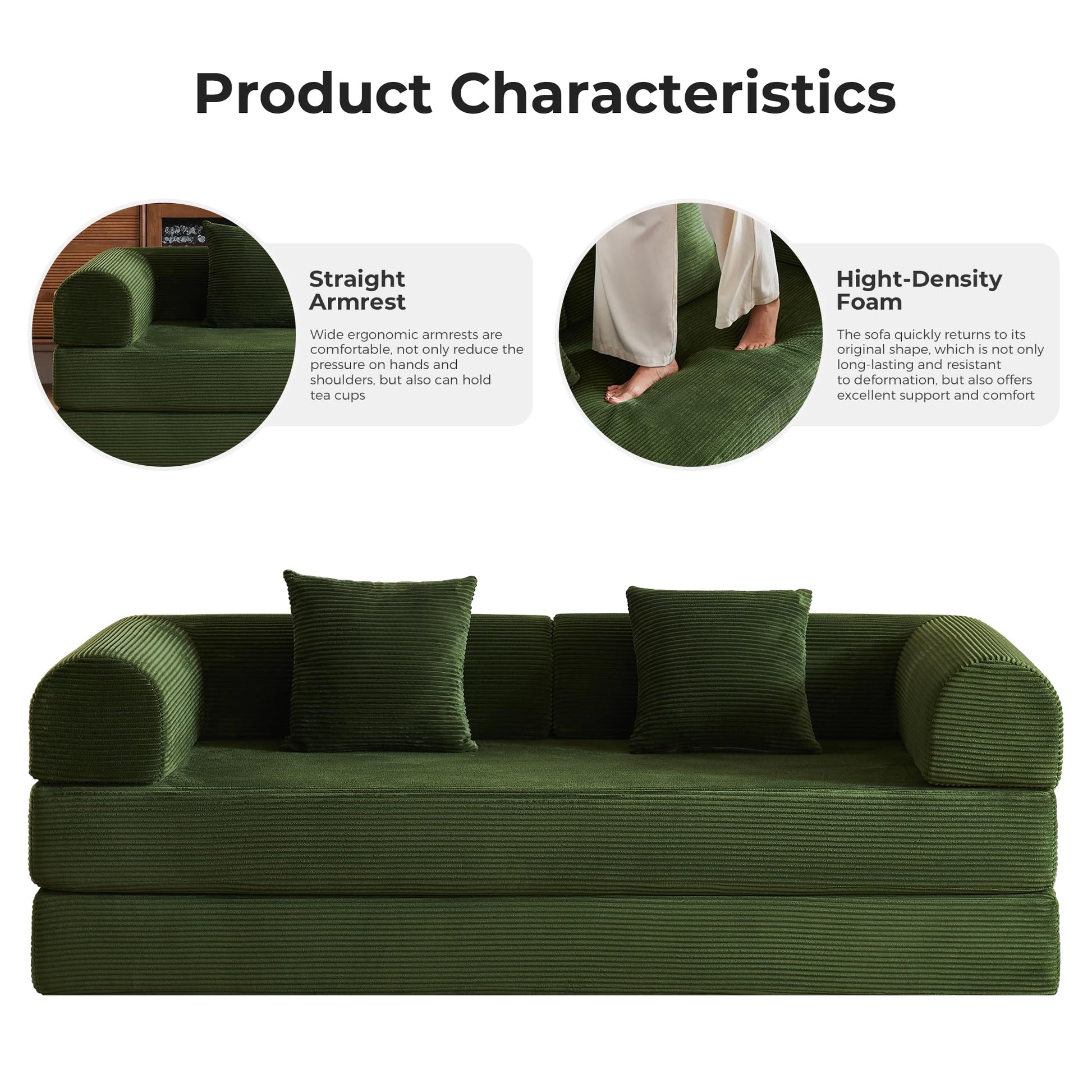 79'' Convertible Sofa Bed, Modular Couch Bed for Small Spaces with 2 Pillow, Corduroy Fabric Sofa with Plush Memory Foam, Floor Sofa Lounge Couch for Living Room Bedroom Lounge Studio(Dark Green)