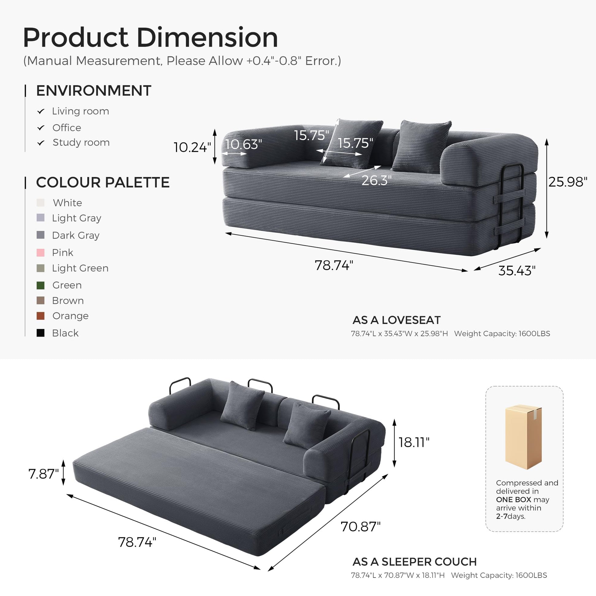 79" Convertible Sofa Bed with Fixed-Shape Frame & Removable Armrests, Modular Corduroy Sleeper Sofa, Folding Mattress Couch for Small Spaces - No Assembly Needed in Dark Gray (Includes 2 Pillows)