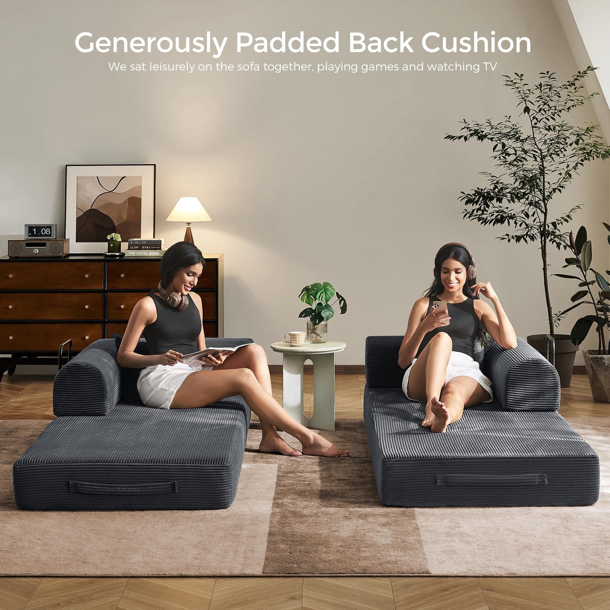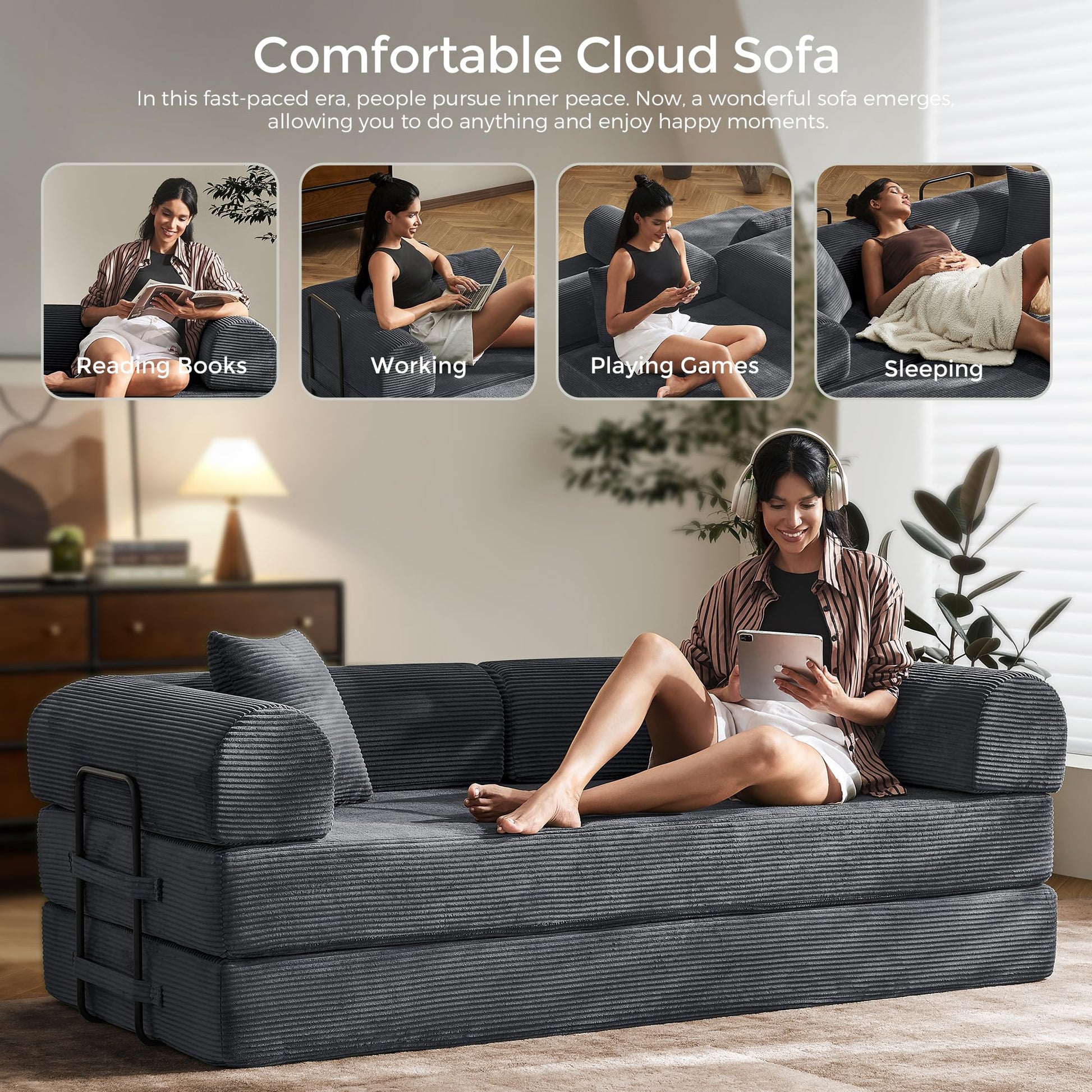 - 5-in-1 Convertible Modular Sofa: Tired of bulky furniture trapping your space? Our Floor Sofa Bed unleashes your creativity, breaking traditional sofa limits! Freely adapt removable armrests, backrest, and base to create a 3-Seat Sofa/Oversized Sleeper Bed/Lounge Recliner/Game Chair/Custom Sectional, perfect for living rooms, dorms, and game rooms — whether hosting guests or enjoying movie nights with family!