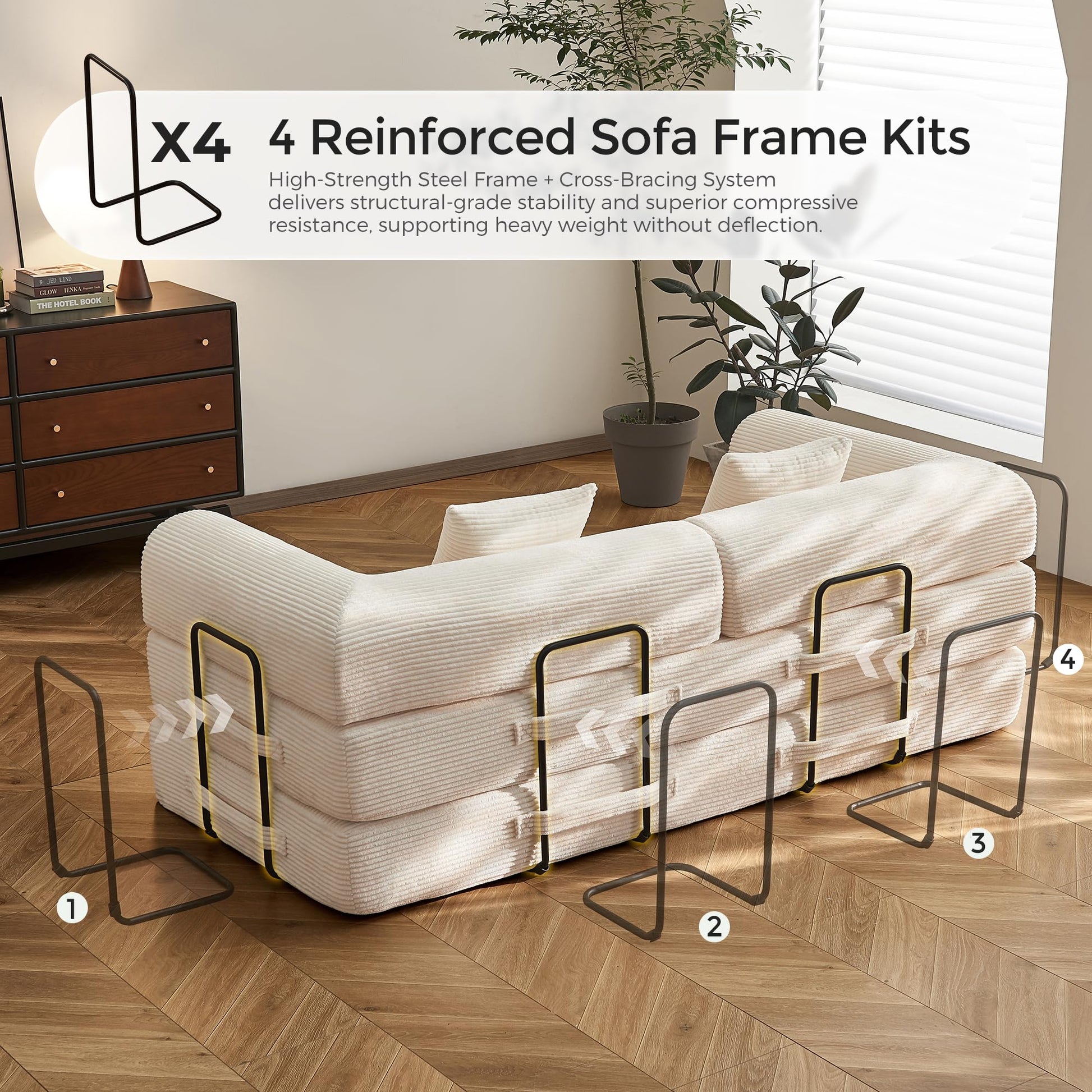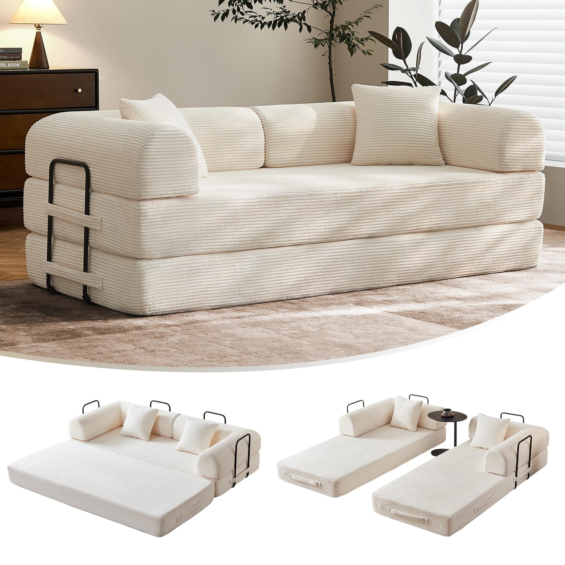 79" Convertible Sofa Bed with Fixed-Shape Frame & Removable Armrests, Modular Corduroy Sleeper Sofa, Folding Mattress Couch for Small Spaces - No Assembly Needed in White (Includes 2 Pillows)