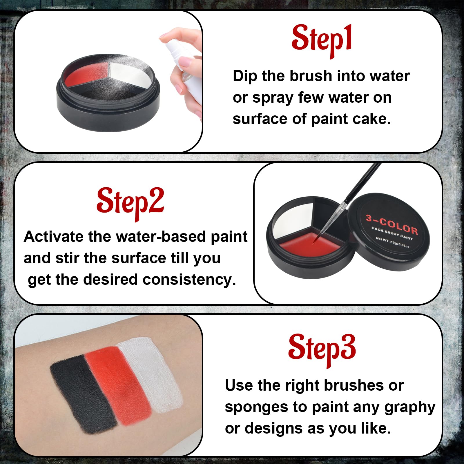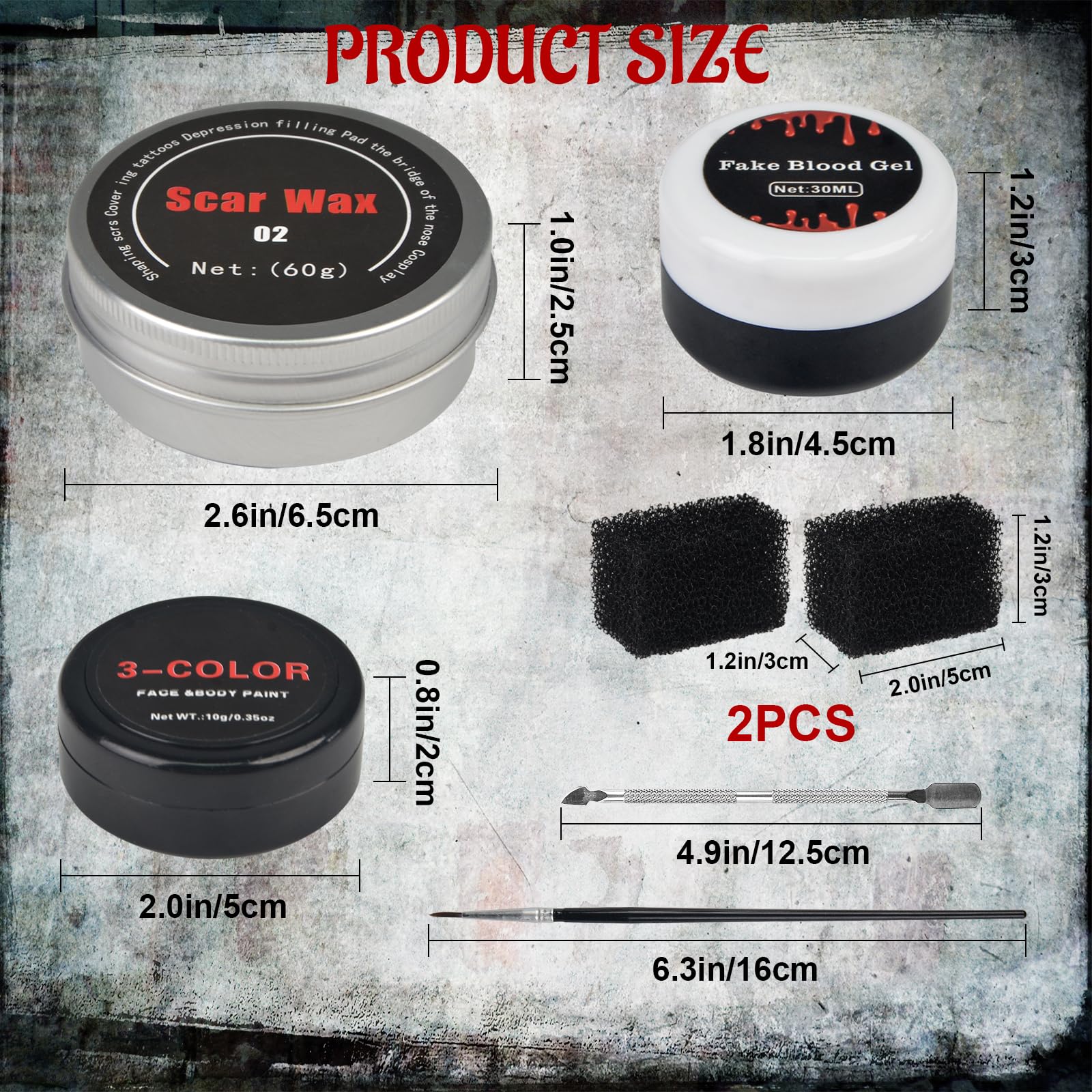 - Halloween Makeup Set: The Halloween makeup kit includes 3 colors makeup face body painting palette, scar wax with double ended spatula tool, fake blood, brush, 2pcs stipple sponges. Multi color and large-capacity design can meet your more needs. Perfect for all your spooky need