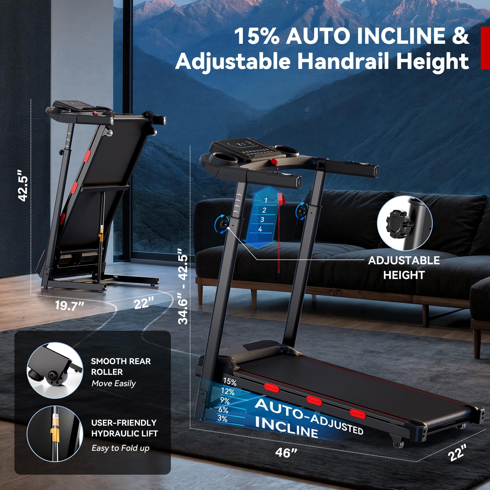 - [15% AUTO INCLINE & Adjustable Handrail Height] This treadmill features an auto-adjusting incline that automatically changes the ramp angle to match your workout program or simulate hills. The handrails can be manually adjusted to your preferred height for added comfort and safety.