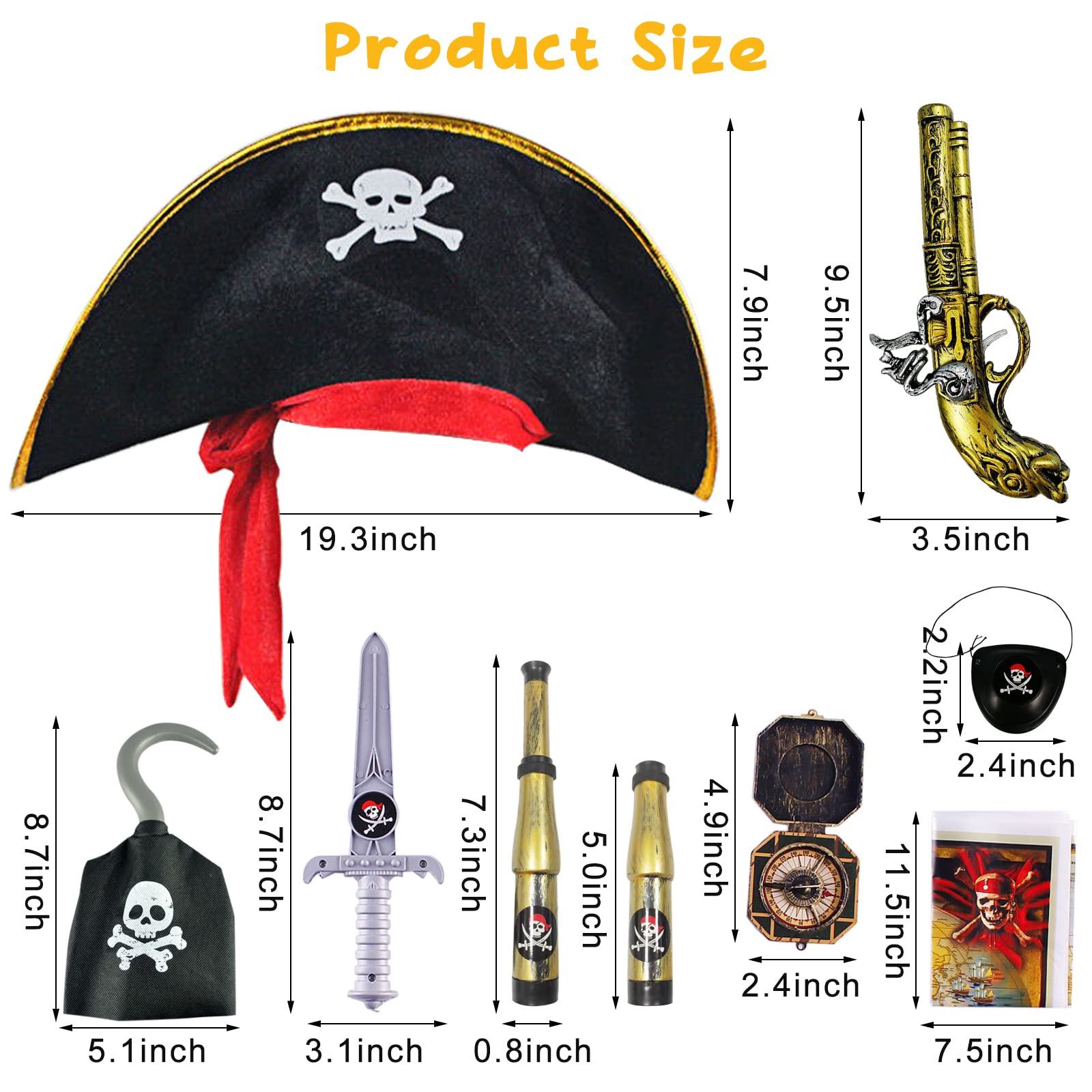 - ️PACKAGE INCLUDES: 1*Pirate Hat, 1*Pirate Pistol, 1*Pirate Eye Patch, 1*Pirate Hook, 1*Pirate Sword, 1*Compass, 1*Telescope, 1*Nautical Map*1, a total of 8 Pirate accessories. Quantities are sufficient for your dressing and wearing needs and are suitable for most children.