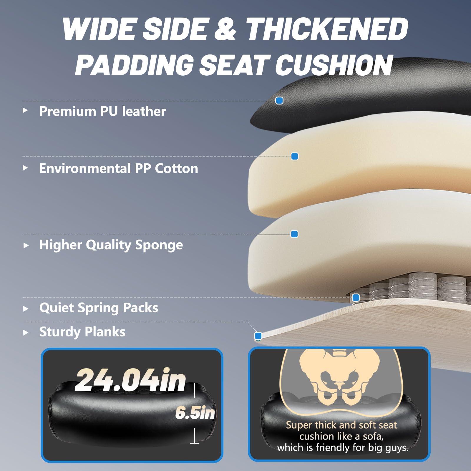 - đăBig and Tall Office ChairăLarge office chair is great for big and tall people. Height adjusts from 19.7" to 22.9". 24.04'' wide and 6.5'' thick spring cushion combines 24.04'' x 30.05'' plus size backrest, very comfortable for you to sit on, reduce your back pain. Desk office chair is made of Premium PU leather with a blend of breathable fabric fiber mesh combines with a 3.4â spring-loaded memory foam base. Adapts to different seasonal temperatures and is warm in the winter and cool in the summer without the sticky feeling of leather.