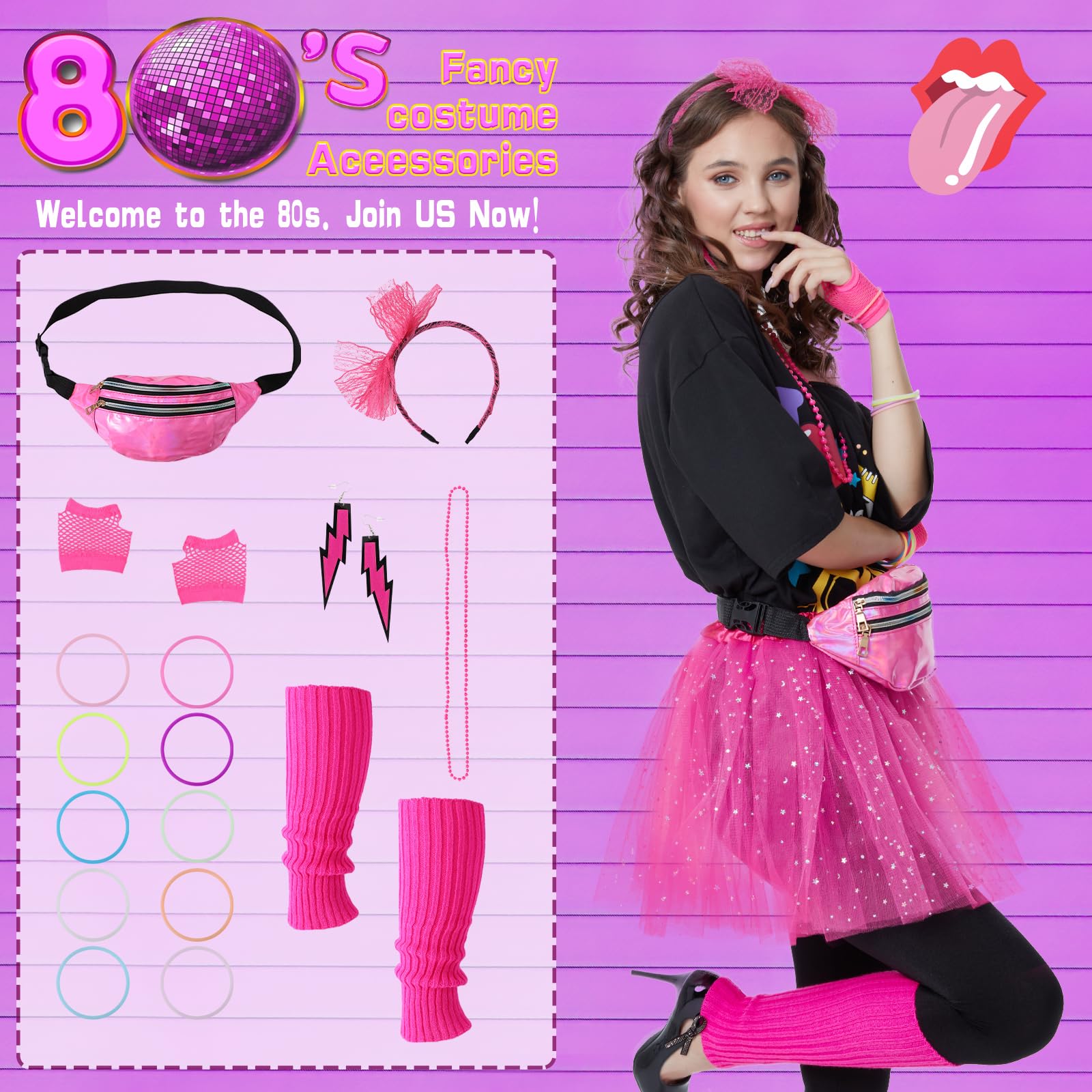 - 80s Outfits Accessories for Women include: The outfit includes 1 lip-printed 80s T-shirt, 1 80s hot pink tutu skirt, 1 80s hot pink Fanny Pack, 1 pair of hot pink 80s fingerless fishnet gloves, 1 pair of 80s hot pink leg warmers, 1 pair of 80s vintage hot pink earrings, 1 80s hot pink lace headband, 1 80s hot pink bead necklace, and 10 silicone bracelets to complete your 80s outfit accessories.