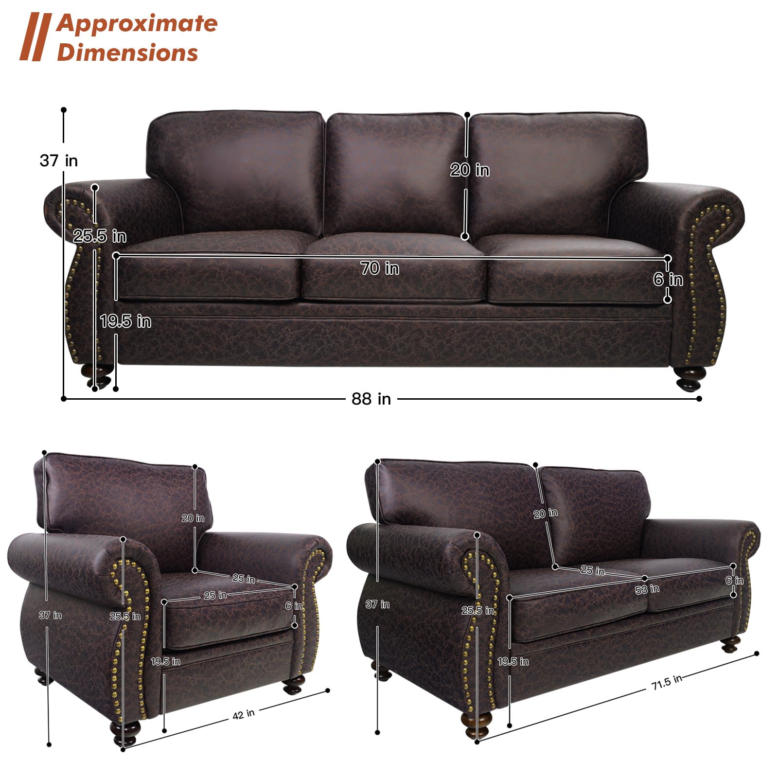 88’’ Rivet Couch,Living Room Sets,Mid-Century Couch, Solid Wooden Frame for Living Room,Upholstered Sofa (Brown, Single+3 Seater)