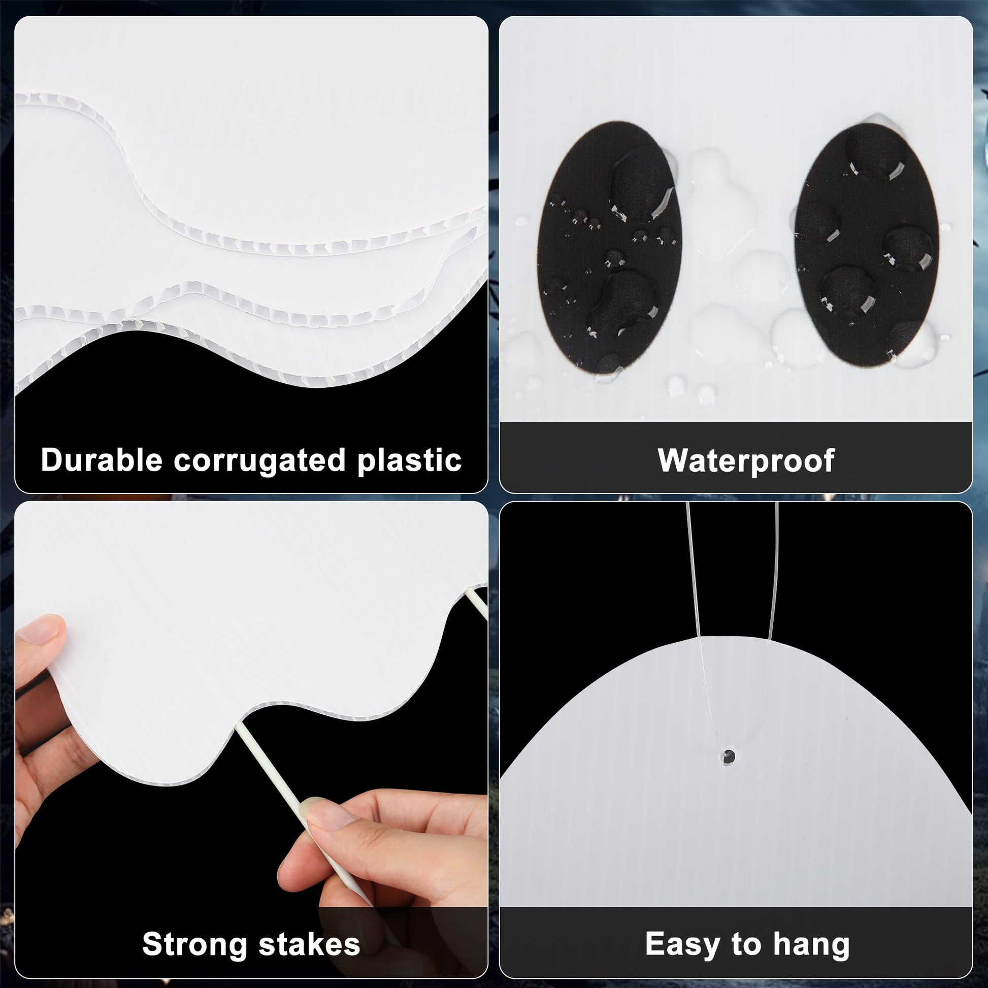 - Easy to use: The top of the ghost yard sign is preset with a 0.5cm diameter hanging hole, and it is equipped with stakes and transparent fishing line. With two decoration methods, hanging or plugging in the ground, you can easily create a terrifying ghost scene on Halloween night in less than 5 minutes