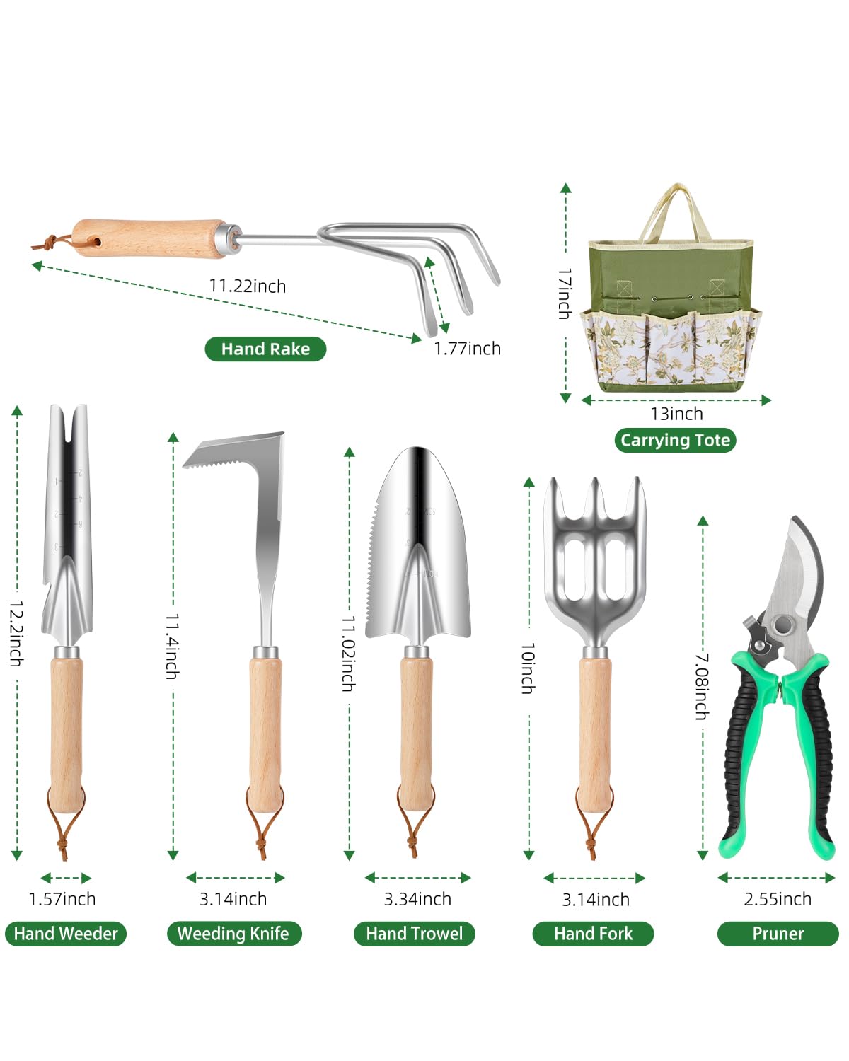 - Heavy-Duty Storage Bag Included: Addressing common concerns about storage, this set comes with a robust floral-patterned tote bag. The vintage-style design not only adds charm to your garden but also keeps your tools (including the pitchfork) organized and easily accessible. Each tool has a designated slot, ensuring they stay secure and ready for use.
