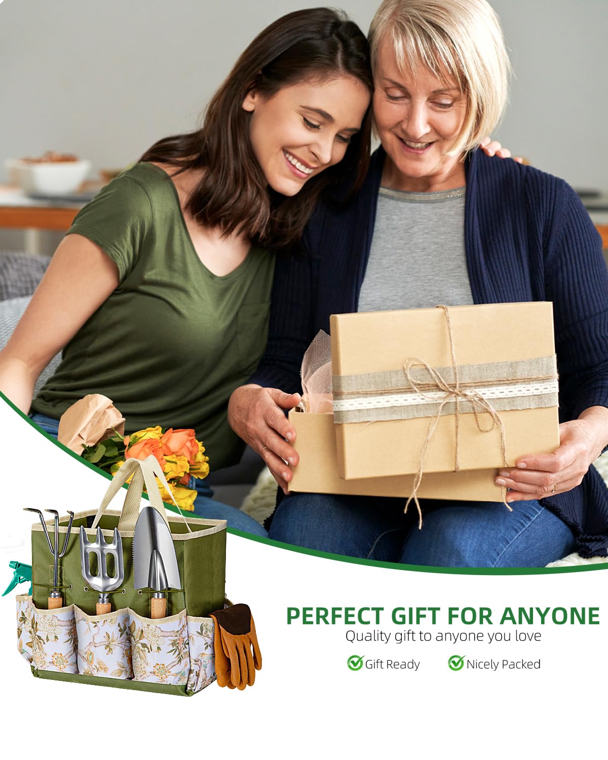 9-Piece Premium Gardening Tool Set for Women - Heavy Duty Stainless Steel Rust-Proof Tools with Fashion Storage Tote | Perfect Gardening Gifts for Mom, Mother's Day, Birthday & Outdoor (Green)