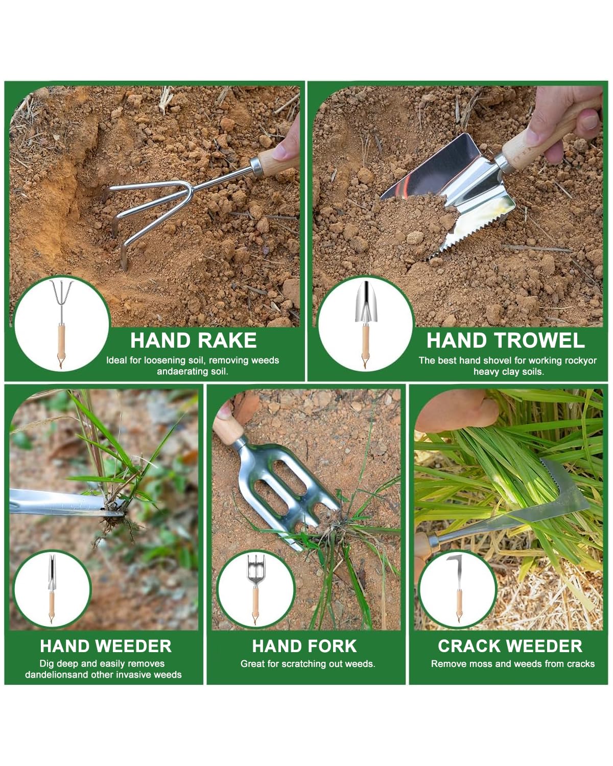 - Ergonomic Non-Slip Handles: Thoughtfully designed for maximum comfort and control, the non-slip wooden handles fit comfortably in hands of all sizes. Whether you're using the pitchfork for turning compost or other tools for digging, carrying, weeding, planting, and pruning, these handles make every task effortless, enhancing both functionality and user experience.