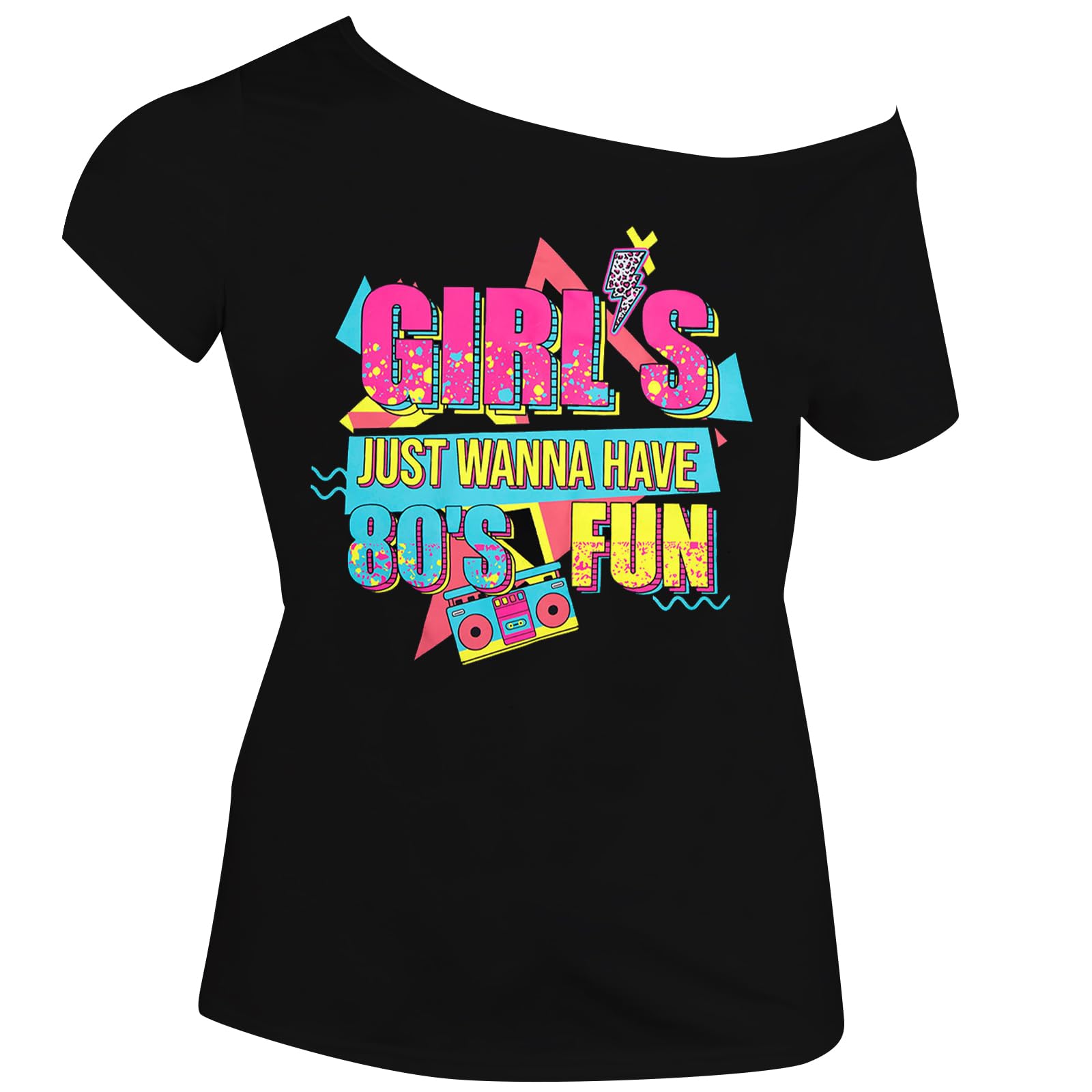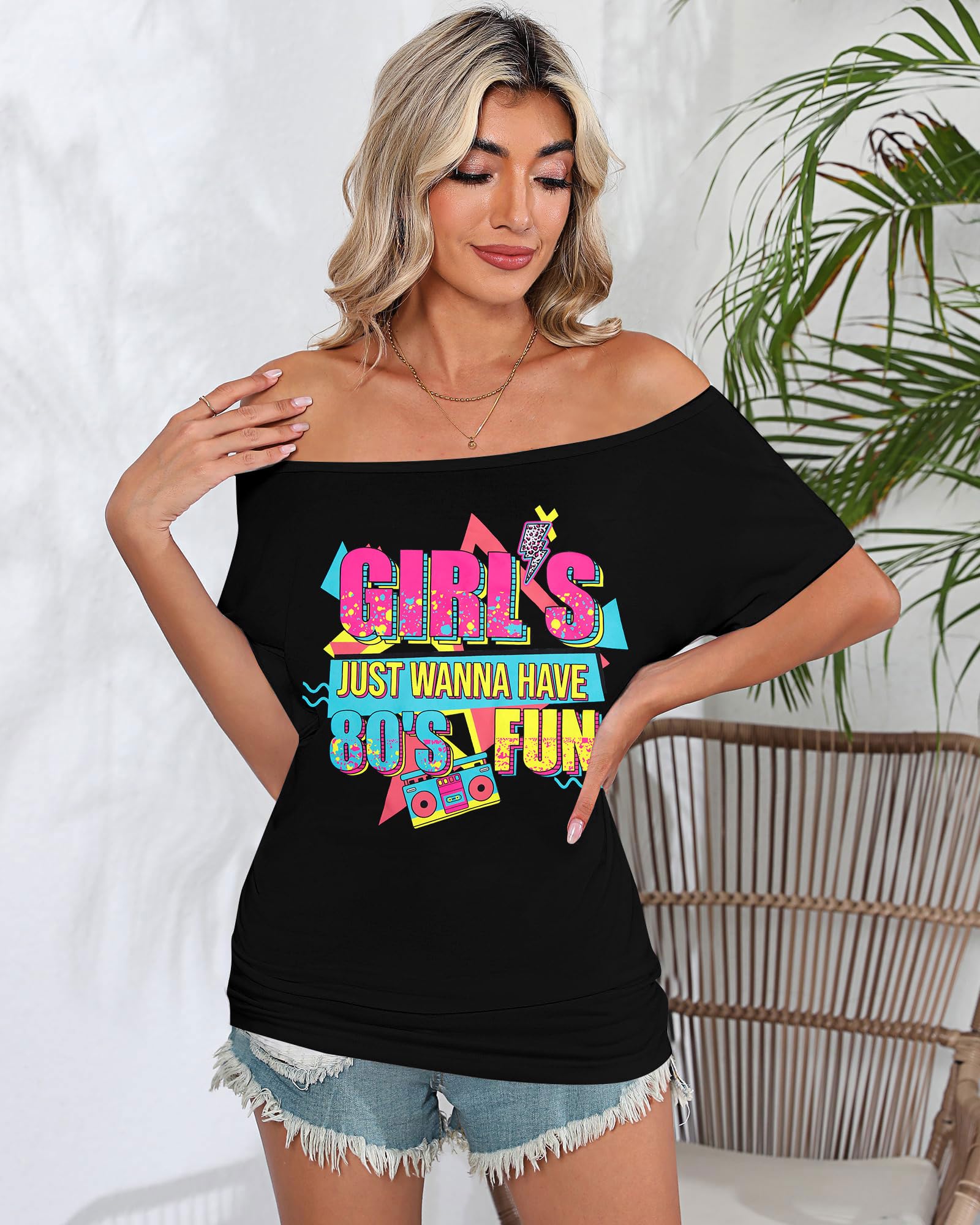 - Bold & Fun Statement Piece: Make a statement with the playful "Girl’s Just Wanna Have 80’s Fun / 90’s Vibe" print! This Off the Shoulder Tops is the ultimate way to show your love for all things retro, bringing fun and nostalgia to every outfit.