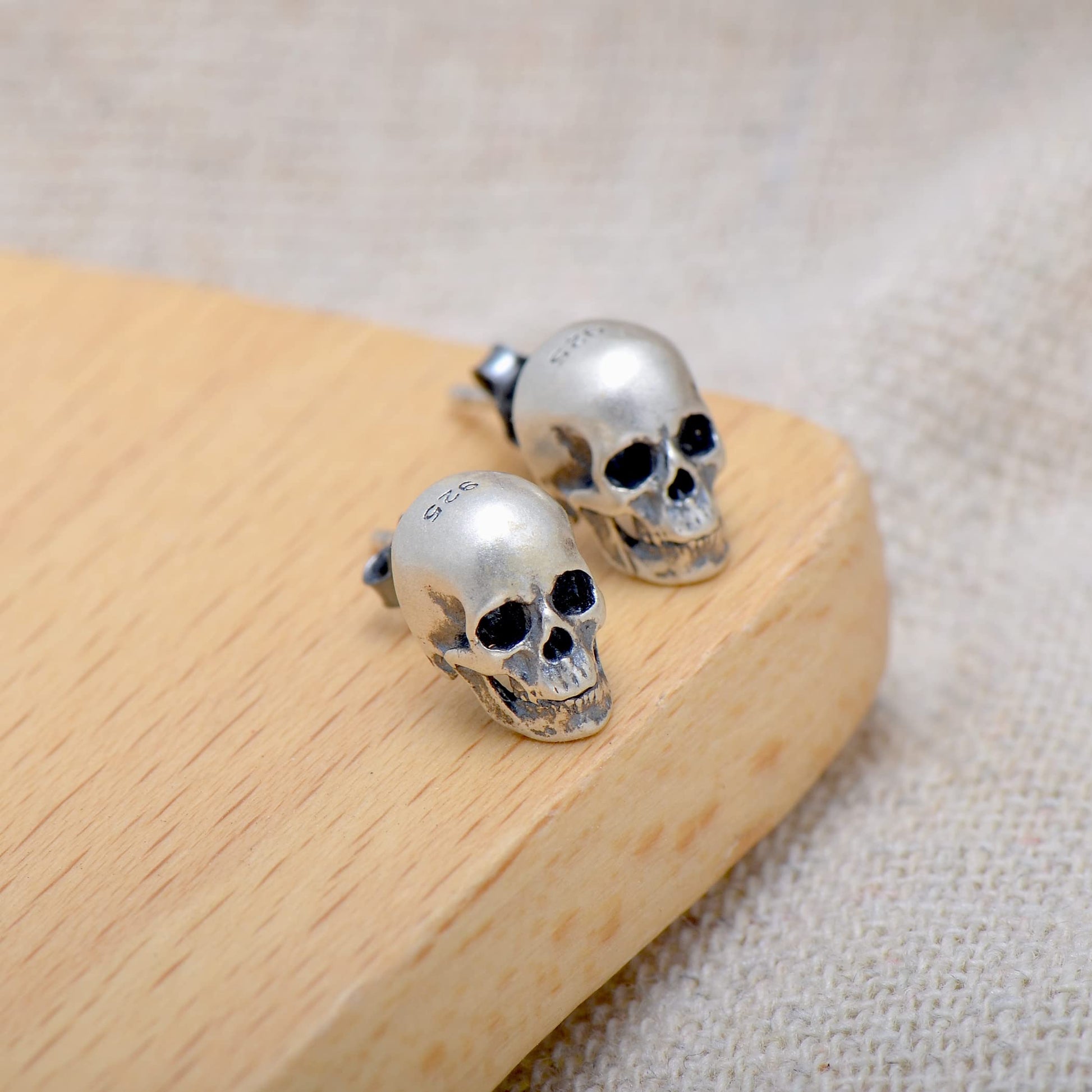 925 Sterling Silver Human Skull Earrings Studs for Men Women Halloween Costume, Oxidized