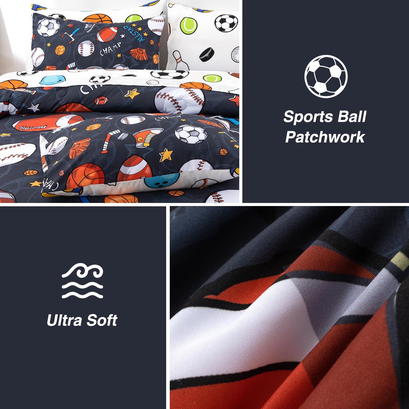 - 【Design】The comforter's is designed with various sports items, soccer football rugby basketball champ and gloves on grey background.The unique comforter set gives your bedroom a stylish decoration, suitable for any room in your house - bedroom, guest room, children's room, vacation room, make your bedroom look like it's in a magazine.