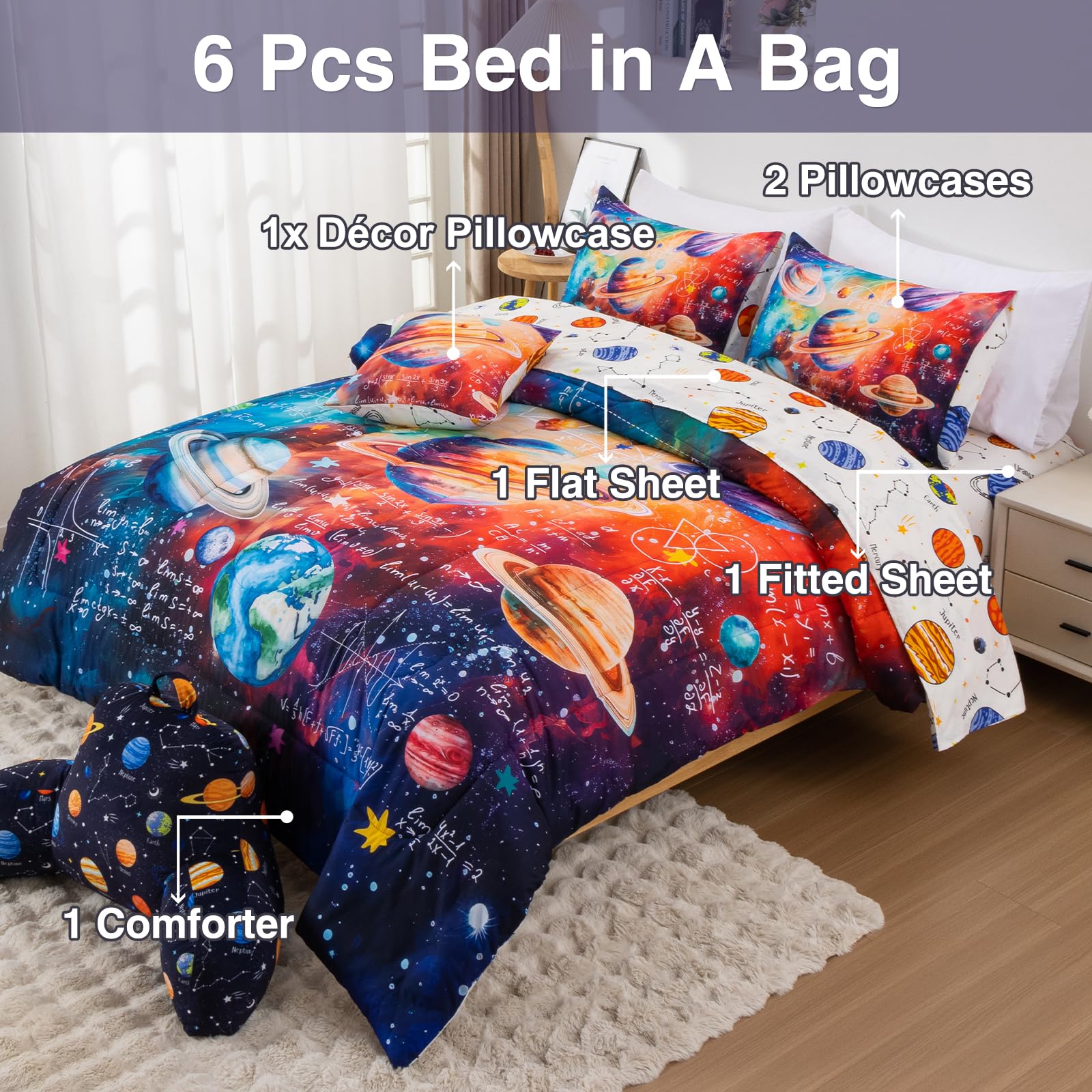 A Nice Night Boys Galaxy Twin Bedding Set 6 Piece Bed-in-a-Bag Comforter with Sheet Set, Space Algebra Theme Polyester Bed Sets for Kids,Purple