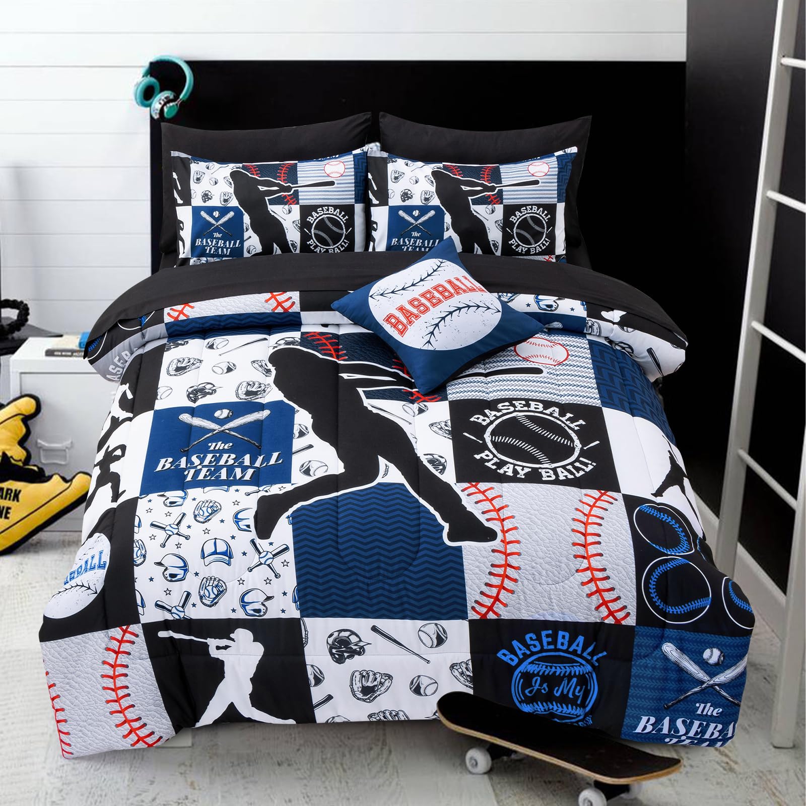 A Nice Night Sports Geometric Grid Black Patchwork Baseball Printed for Boys Twin 6Pcs Bed in A Bag Comforter Bedding Set,Blue