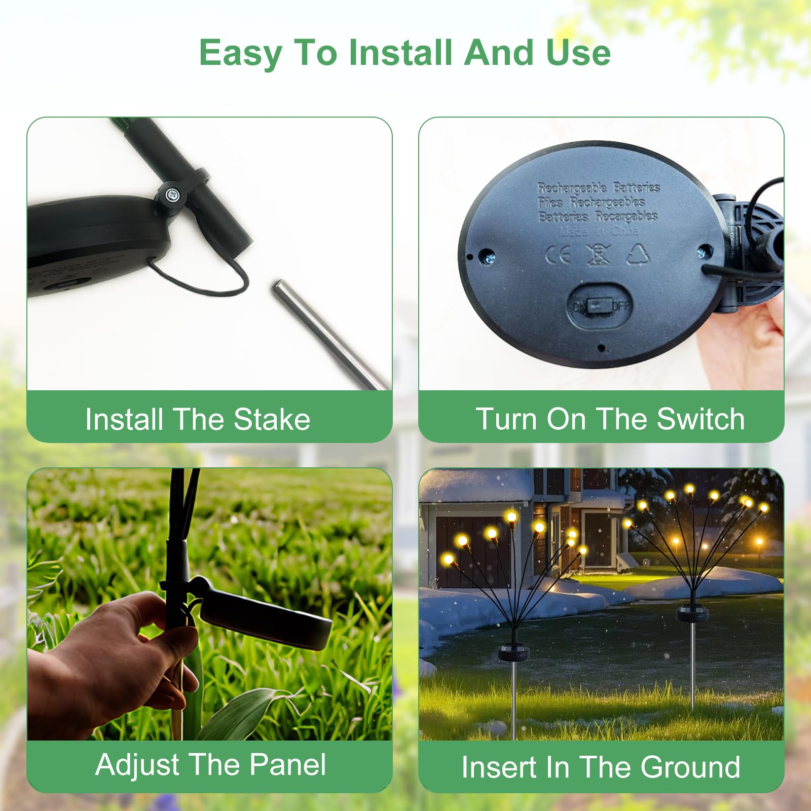 - đăPretty Simple InstallationăNo need for plugs and wires, just plug it into the ground and turn on the switch behind the solar panel to light it up. The firefly lights solar outdoor complement the starry sky at night, making your garden beautiful! These solar garden lights outdoor can decorate your garden, yard, landscape, driveway, patio, and pathway, as well as parties, weddings, and anniversaries!