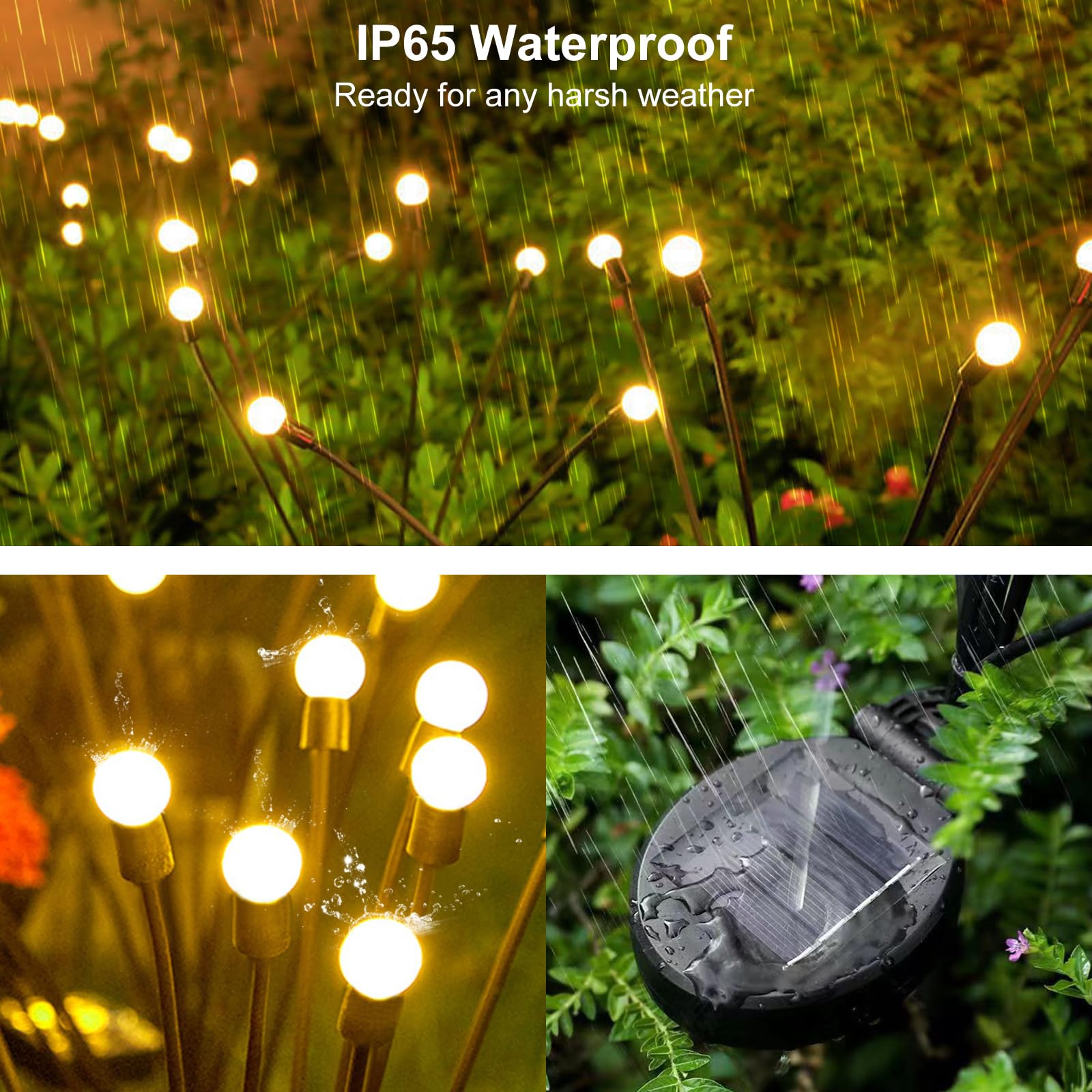- â¨ăHigh-quality & All-weather FearlessăLight for a whole night! With high-quality and large-size monocrystalline silicon solar panels, 20% highly efficient photoelectric conversion rate. The solar firefly lights with IP65 waterproof tech and ABS material, sealed completely, sturdy and lasting life, and can withstand the influence of bad weather such as rain, snow, and hail. Perfect for your outdoor garden decor with these solar garden lights.