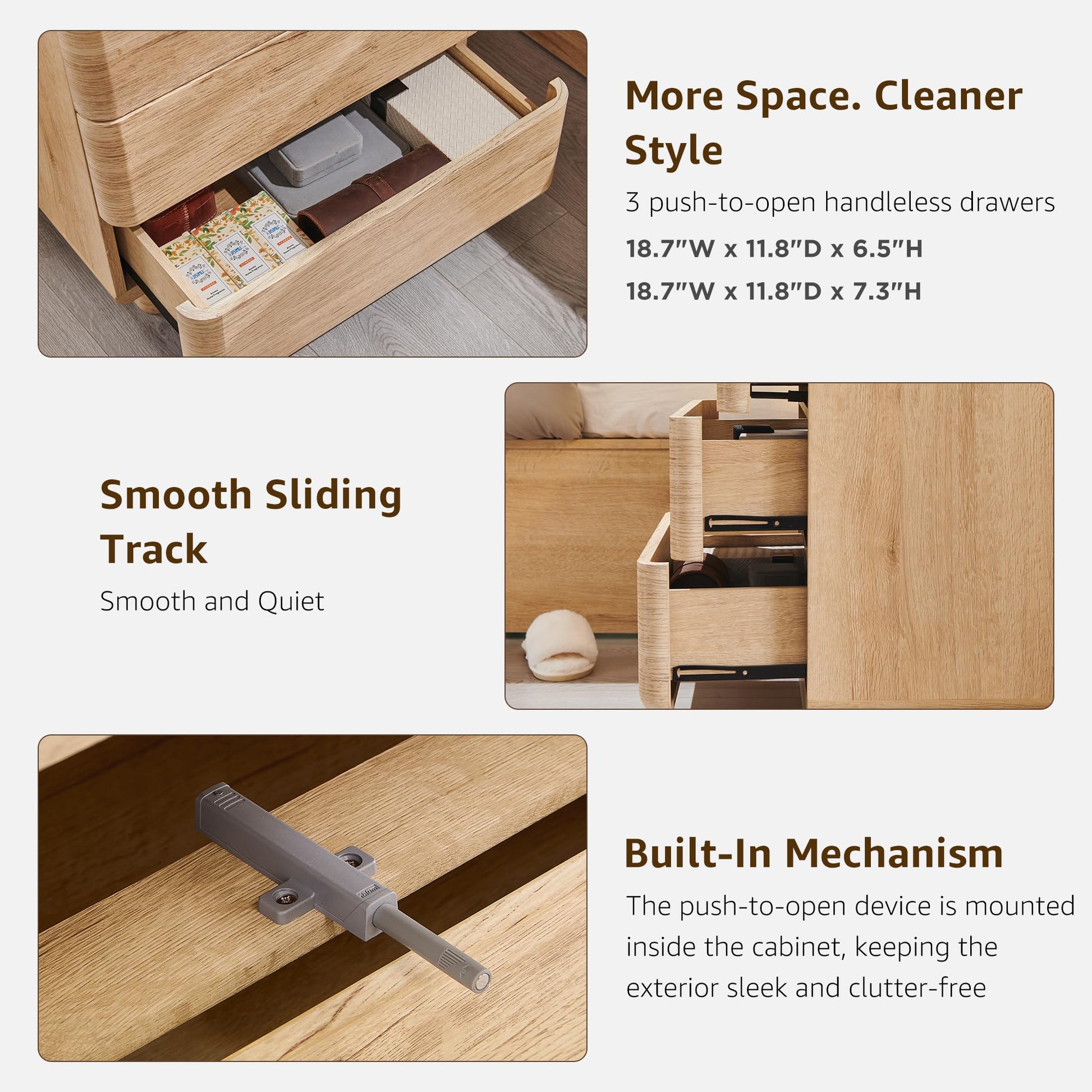 - 3 Push-to-Open Drawers for Effortless Storage: Featuring 3 spacious drawers(18.7"W x 11.8"D x 6.5"H & 7.3"H) with push-to-open functionality, this night stand makes organizing easy and clutter-free for those who dream of a smooth, minimalistic bedroom without knobs or handles. Just tap to open — push openers are mounted inside the cabinet, allowing you to open the door without knobs or handles for a clean, sleek room look. perfect for storing books, remotes, chargers, or daily essentials