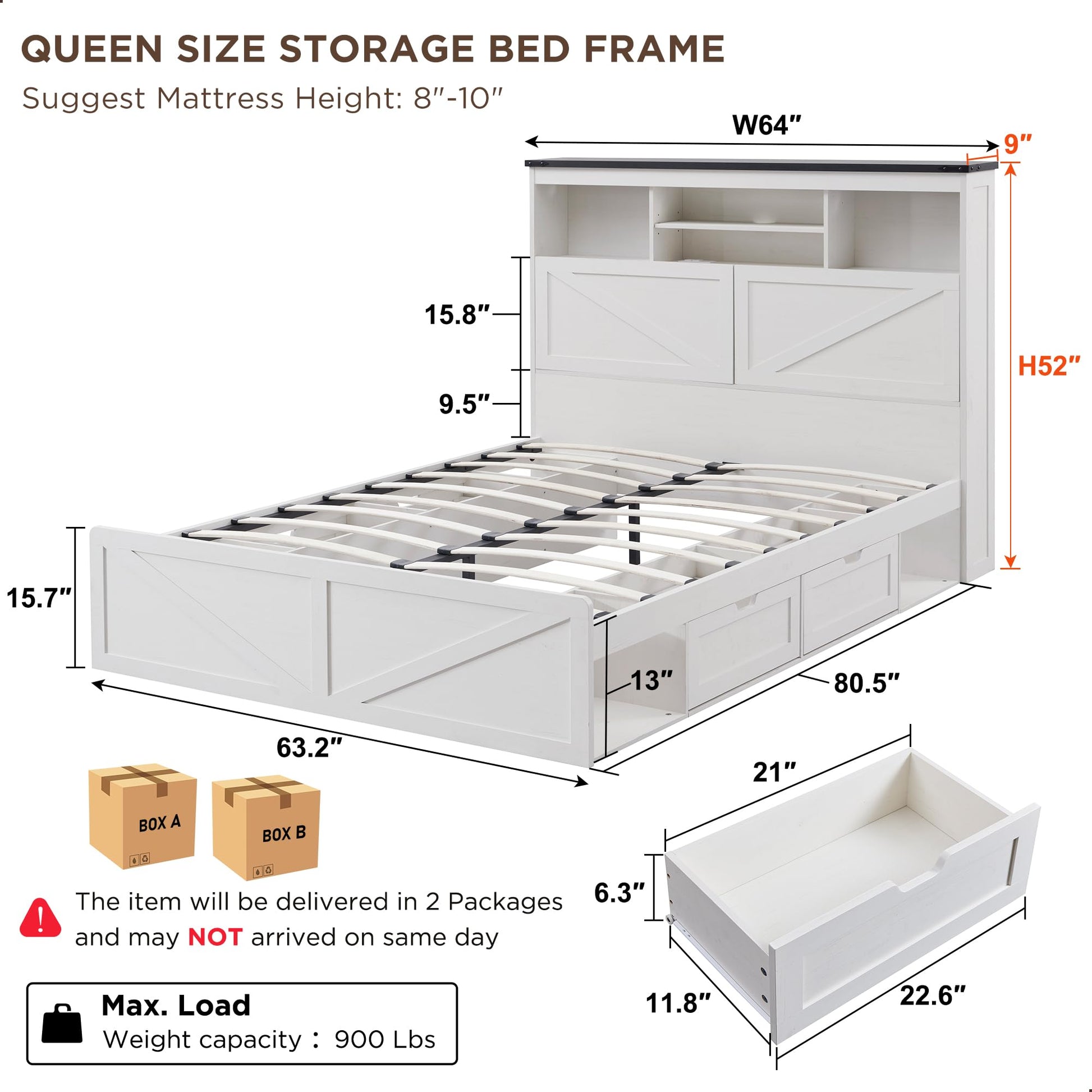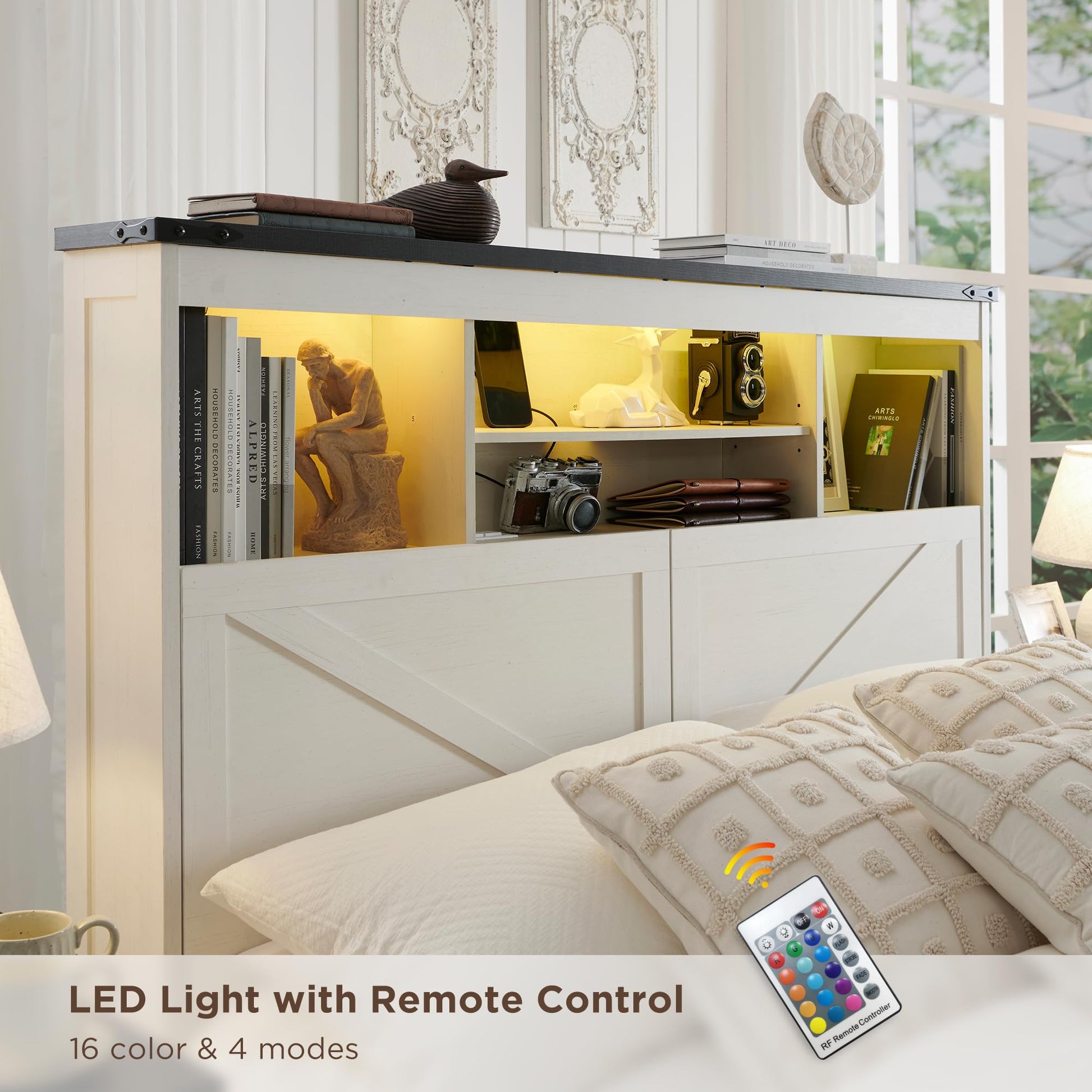 ACCOHOHO Farmhouse Queen Size Wood Bed Frame with 52" Tall Storage Headboard and 4 Drawers,LED Light,Charging Station,Solid Wood Slats Support,Noiseless,No Box Spring Needed,Antique White