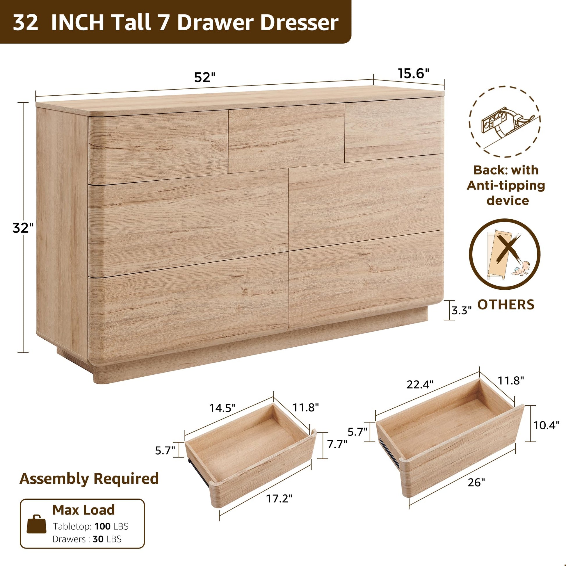 ACCOHOHO Modern 7 Drawer Dresser for Bedroom, 52" Wide Handleless Chest of Drawers, Push-to-Open Large Wood Storage, Dresser TV Stand for Bedroom, Living Room, Hallway, Curved Profile, Natural Oak