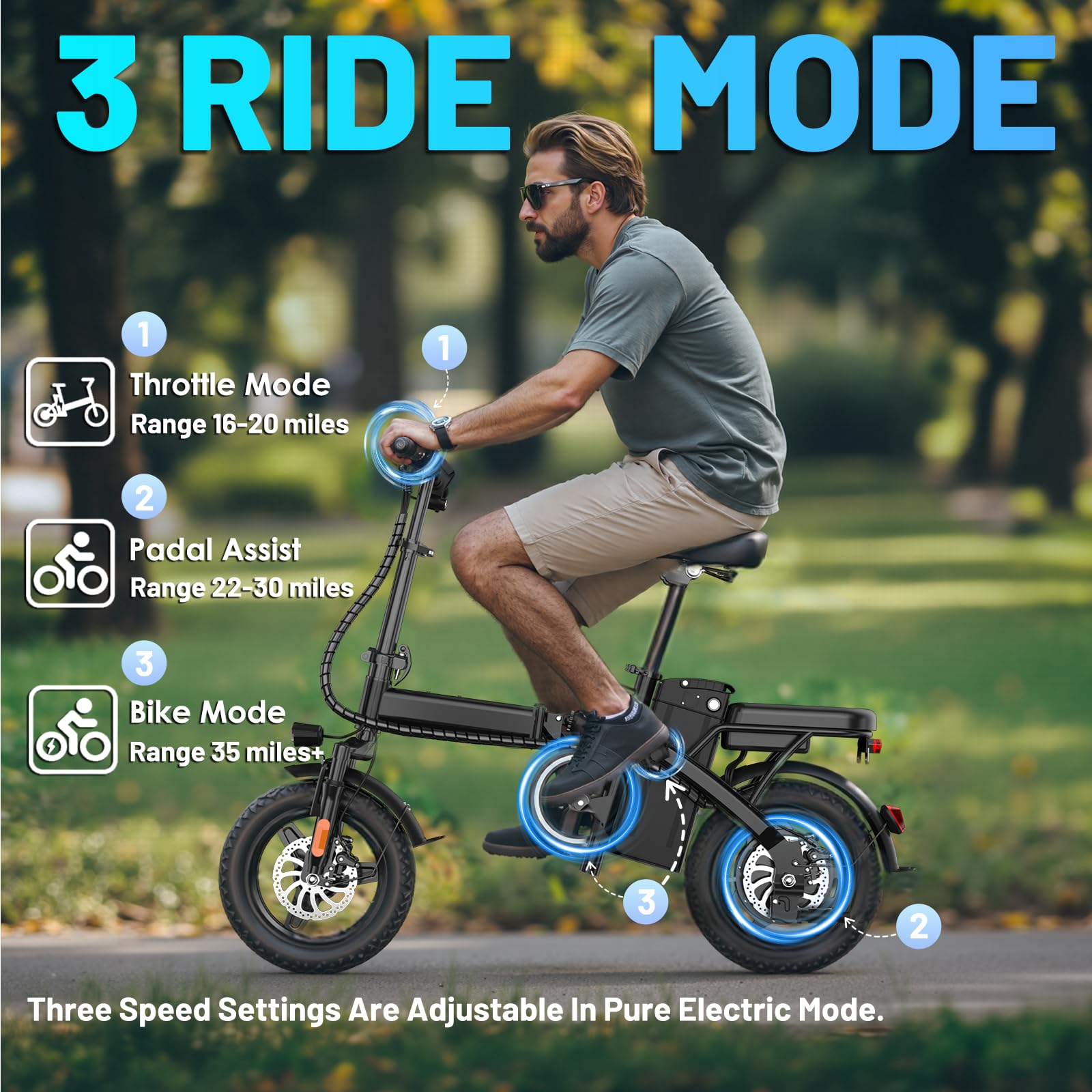 - FOLDABLE DESIGN - This 14" foldable e-bike quick-folding frame allows for easy storage and transport, whether in a car trunk, apartment and office etc, making it a stylish and reliable companion for daily commuting or leisurely rides.